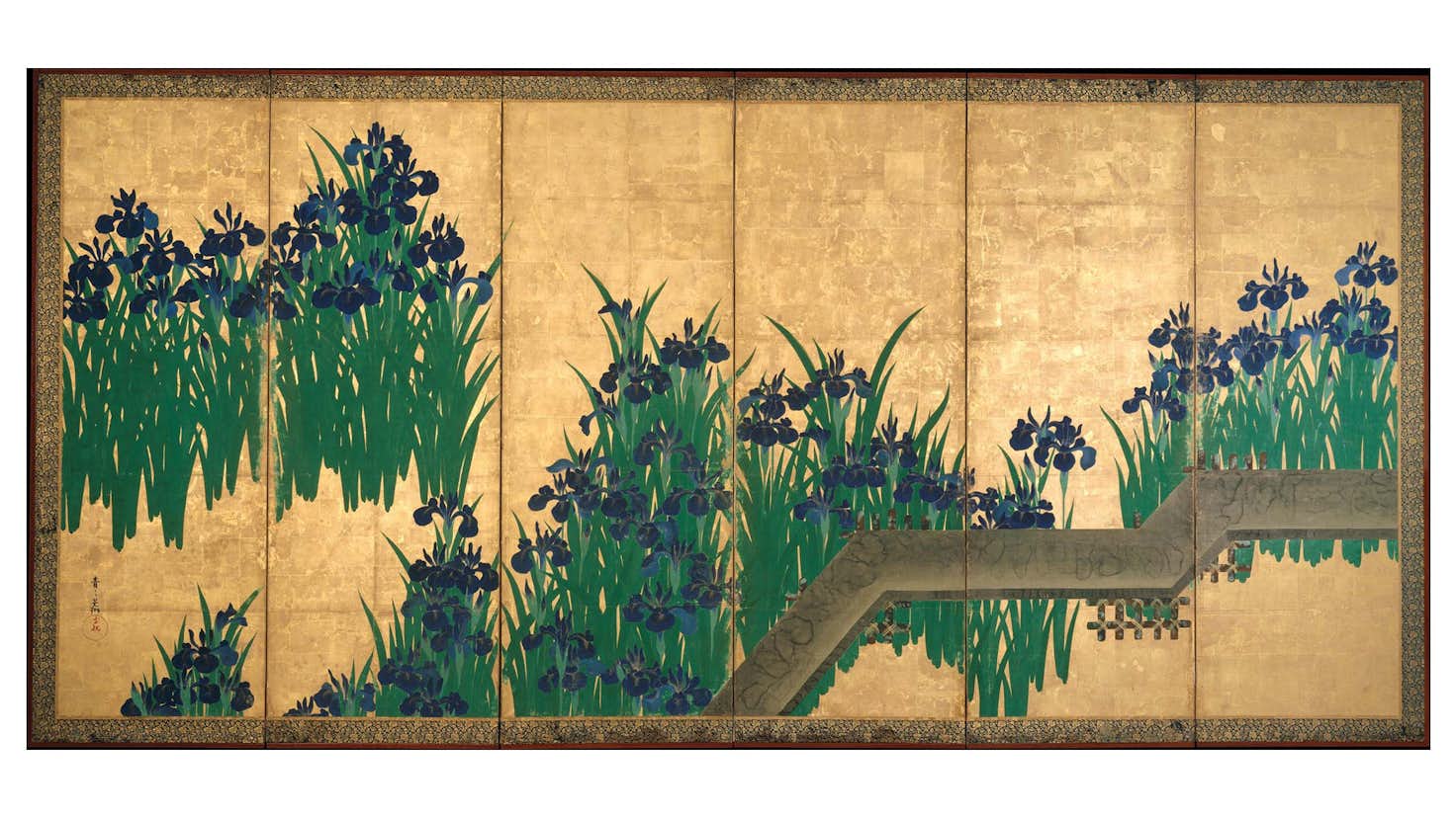 尾形光琳は1658(万治元)年、京都有数の呉服商・雁金屋の次男として生まれる。尾形乾山は5歳年下の弟。本阿弥光悦、武将の浅井長政とゆかりのある家系であり、光琳の幼年期に雁金屋は最盛期を迎える。幼少の頃より能を嗜み、書画にふれ、俵屋宗達に私淑した。30歳のときに父を亡くし遺産を相続するが、放蕩癖に加えて時局の変化に伴い家業が傾き、40歳を前にして画業で生計を立てていくことを決意する。その後の絵師としての活躍はめざましく、かねてより交流のあった二条綱平が有力なパトロンとなり、44歳のときには法橋に叙せられるに至る。金地背景に燕子花の同一モチーフを反復した《燕子花図屏風》(18世紀)は、法橋叙任直後に制作したもので、呉服商出身の光琳ならではの着想と言える。