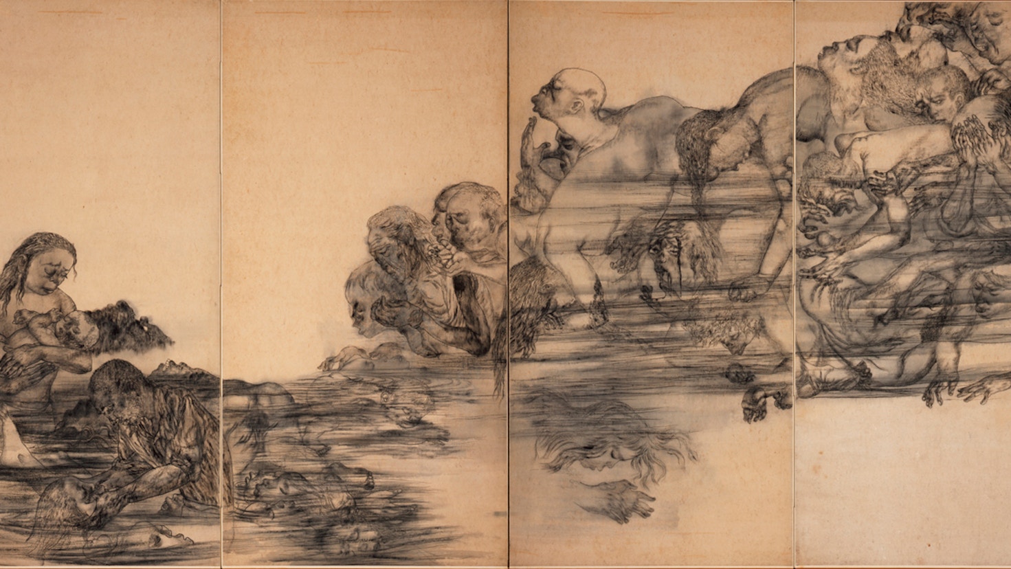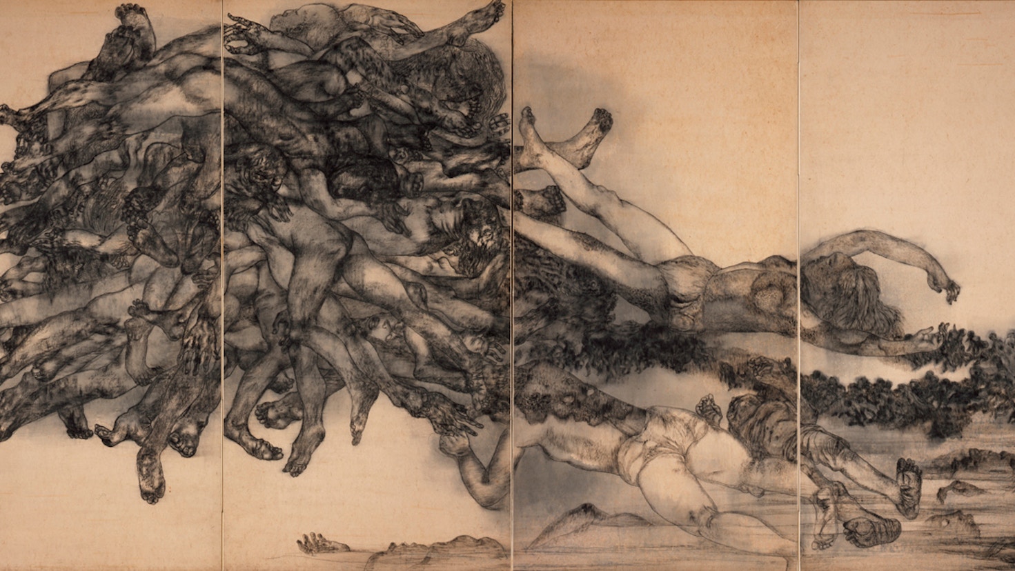 丸木位里と丸木俊は、原爆投下後の広島を見た経験をもとに、1950年から《原爆の図》の共同制作を開始。洋画家の俊が堅牢なデッサンで人物を描き、これを押し流すように位里が水墨を重ねていくという、2人の激しいぶつかり合いの中で生みだされた作品は、日本画と洋画、前衛と伝統といった美術史の枠組みではとらえきれない力で、いまなお強い存在感を放っている。
