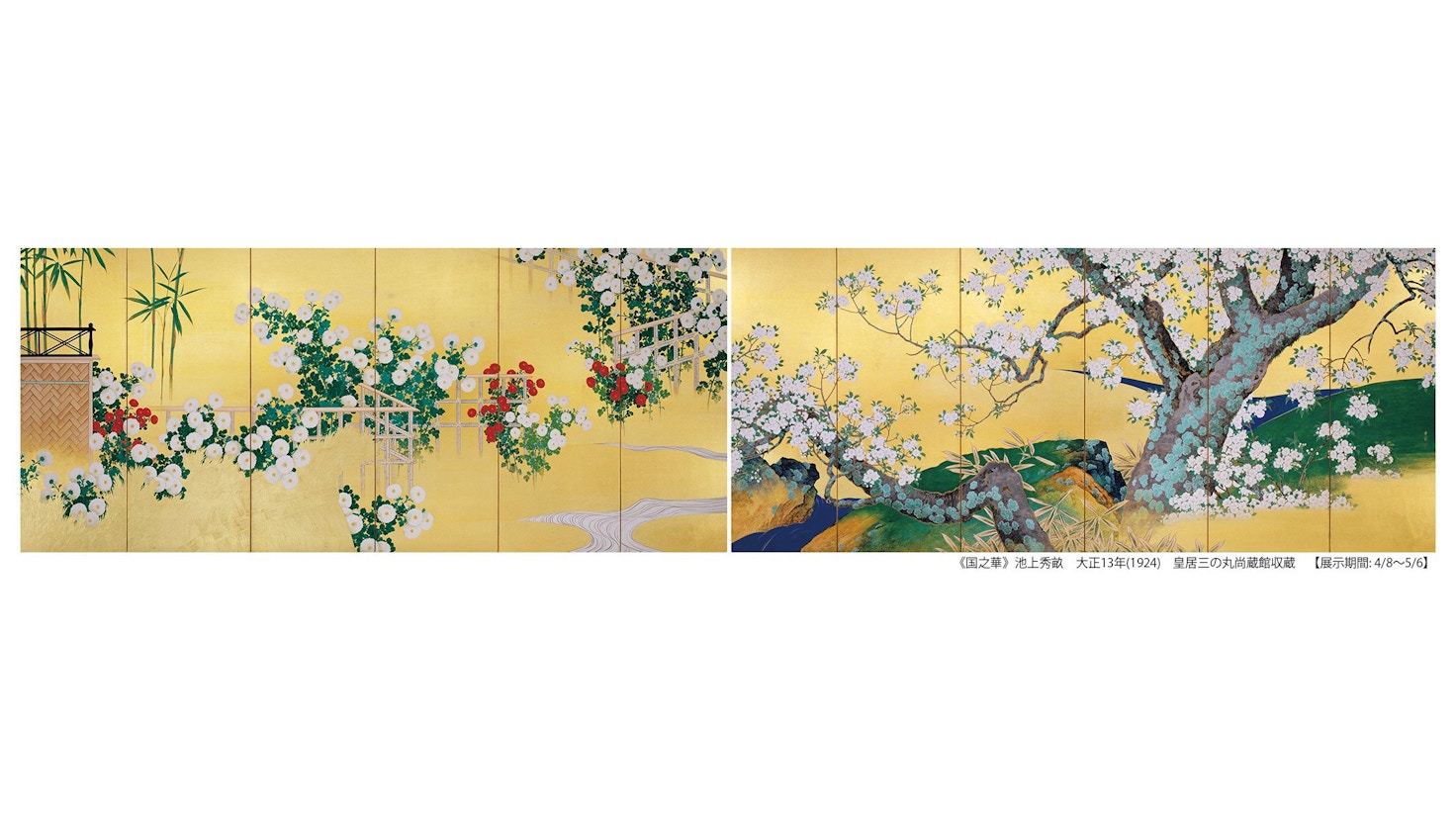 本展では、皇室伝来の貴重な収蔵品のなかから、花を題材とした11世紀から現代にいたる絵画・工芸・書跡45件を紹介する。また伊藤若冲によって制作された国宝《動植綵絵》のうち、花を描いた4幅を公開。前期では《桃花小禽図》と《牡丹小禽図》、後期では《梅花小禽図》と《薔薇小禽図》が展示される。