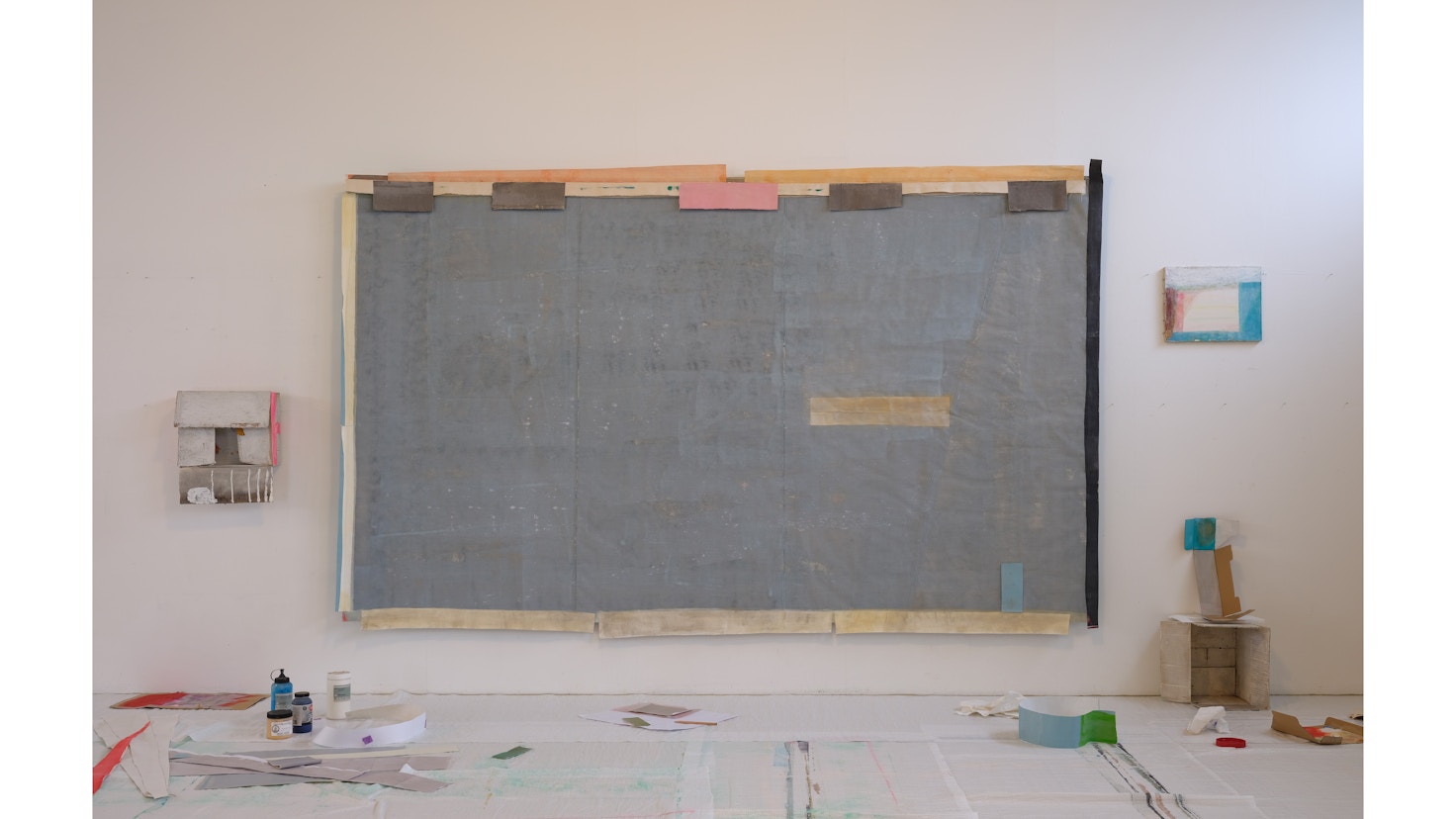 本展では、杉戸が近年注目している「余白」に焦点をあてる。作品には、小さな家や船、果物、木々、雨粒といった身近なモチーフが登場し、線や幾何学的なかたちとともに繊細かつリズミカルに構成されている。杉戸は、カンヴァスの縁に貼られた紙や木片のように、普段は目立たない部分=「えり」や「へり」に着目し、表面の外側にある存在や余白を見つめる。その視点は、本の「あそび紙(flyleaf)」や洋服の「裏地(liner)」など、あらゆるものに潜む見えない領域へと広がっている。