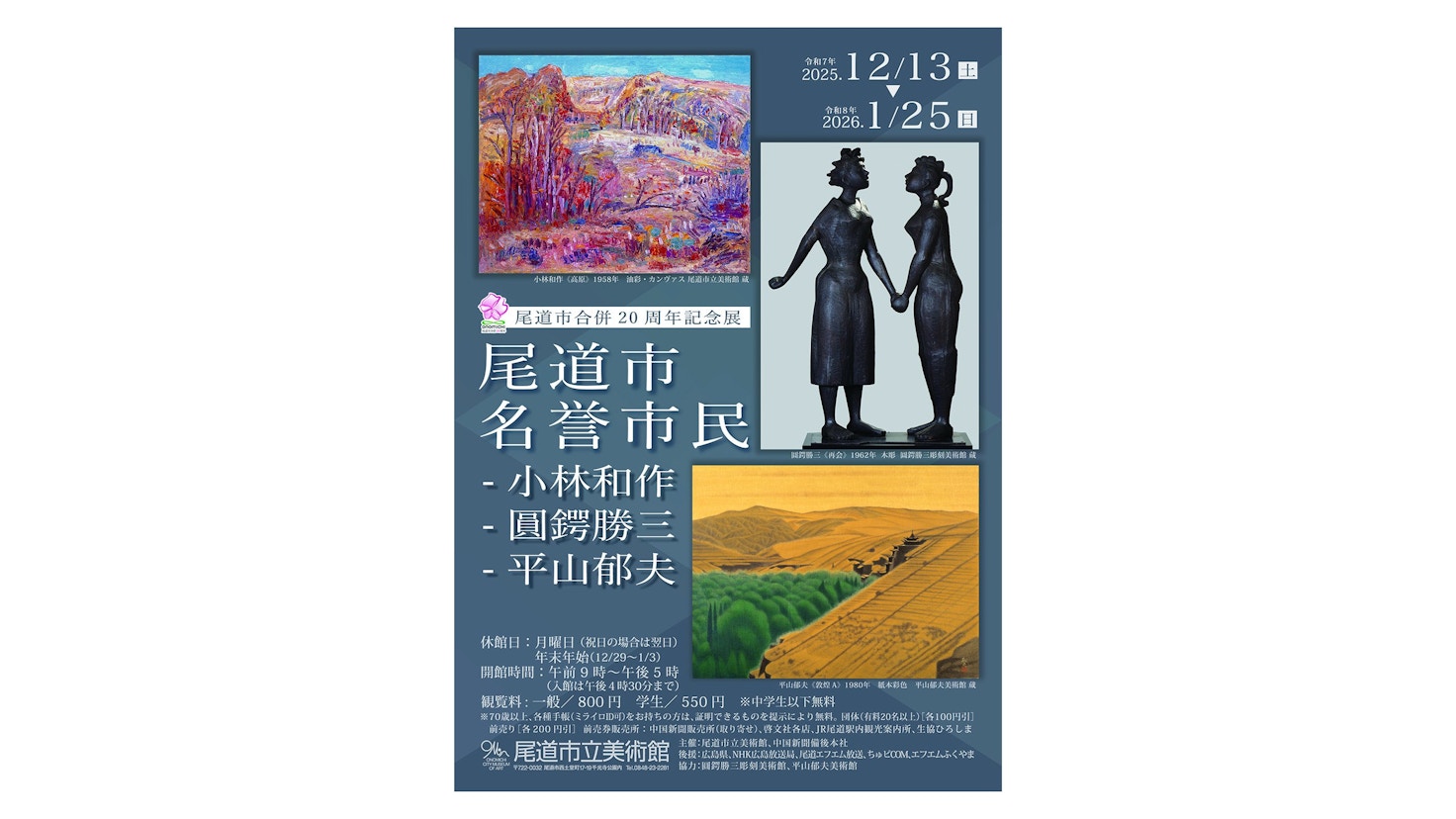 本展では、平成の大合併により現在の尾道市となった経緯を背景に、尾道市の名誉市民である小林和作、圓鍔勝三、平山郁夫に注目する。圓鍔勝三彫刻美術館および平山郁夫美術館からの出品作に、尾道市立美術館が所蔵する小林和作コレクションをあわせて展示し、洋画・彫刻・日本画の各領域において一時代を築いた3人の歩みを紹介する。