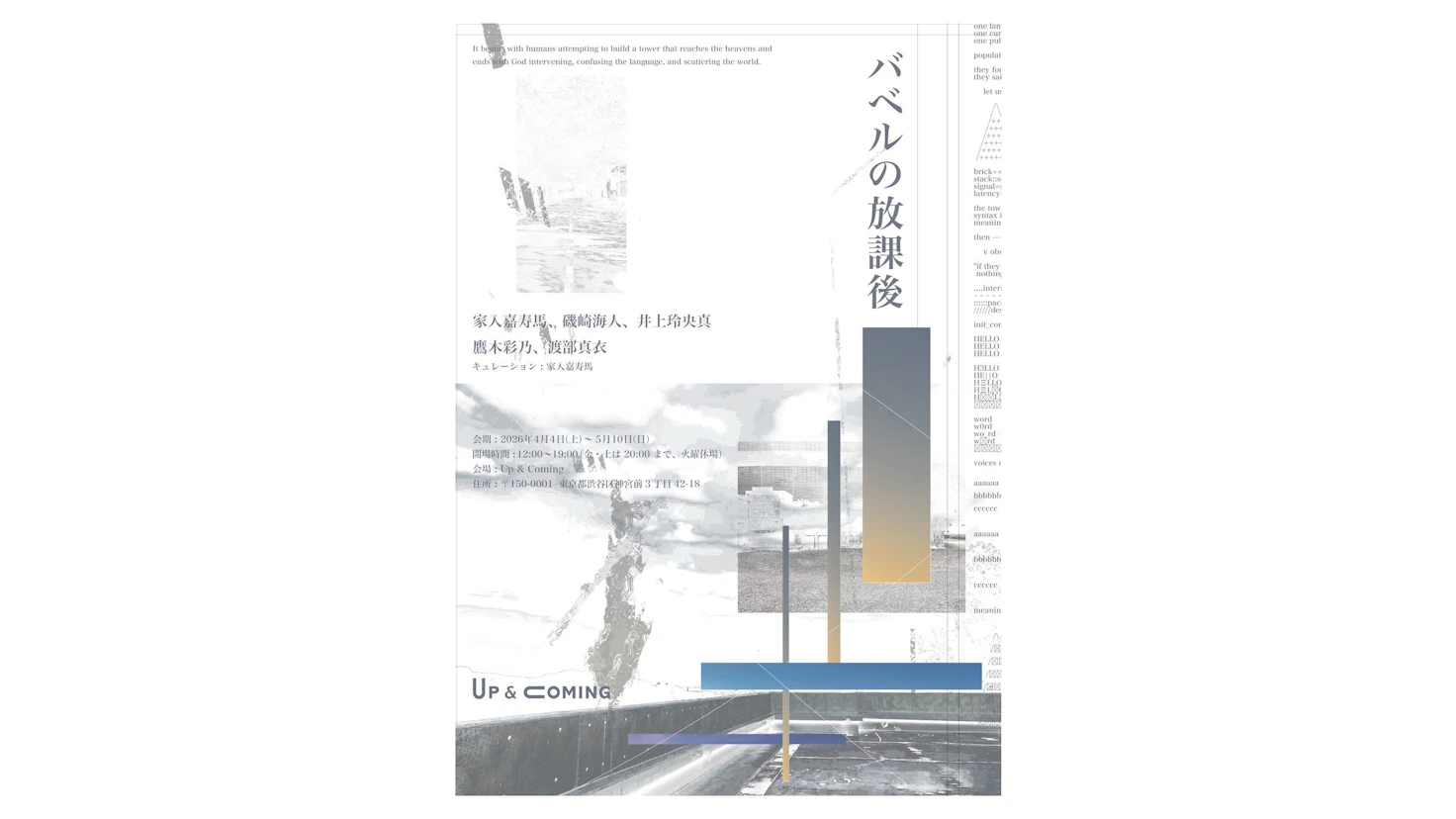 今回の展示は、異なる出自や視点を持ちながら同じ大学を経験した出展作家たちによる実践として、バベルの神話と個々の体験を重ね合わせることにより、何かが生成される過程についての一例を提示。世界の観測者であり制作者でもある主体によって生み出される風景が、やがて現実に流通し、新たな物語へと連なっていくあり方をたどる。