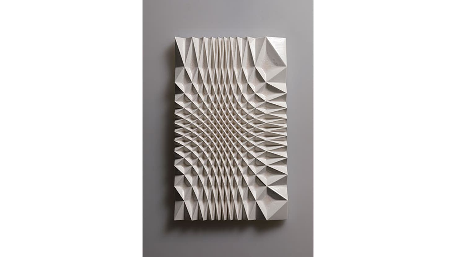 奈良自身が幼少期を過ごした金沢の壮大な雪景色から作品の着想を得たと言う同シリーズは、平面と立体の間のようで、線と面の間でもあるような不思議な揺らぎを持ち、巧緻を極めた美しい幾何学模様がふんだんにかけられた釉薬によって神々しく光り輝く。
