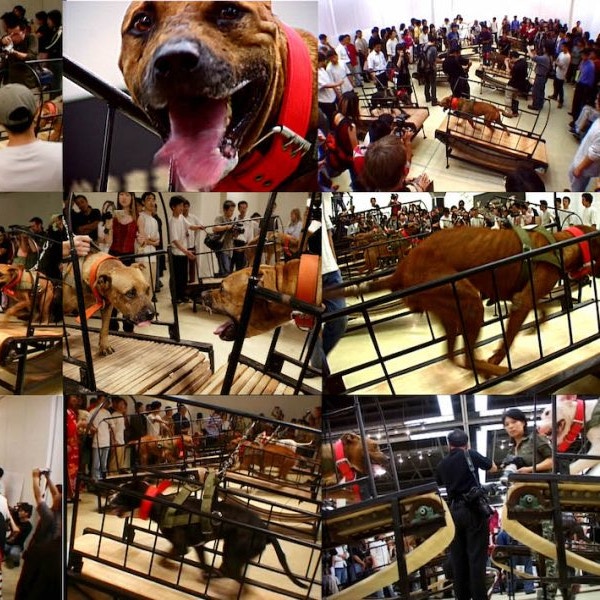 自走式スレッドミルに繋がれた犬たちが、お互いを目掛けて走るが、相手に近づくことはできない。グッゲンハイムの展示では、2003年のパフォーマンスをビデオに収めたものが展示される予定だった