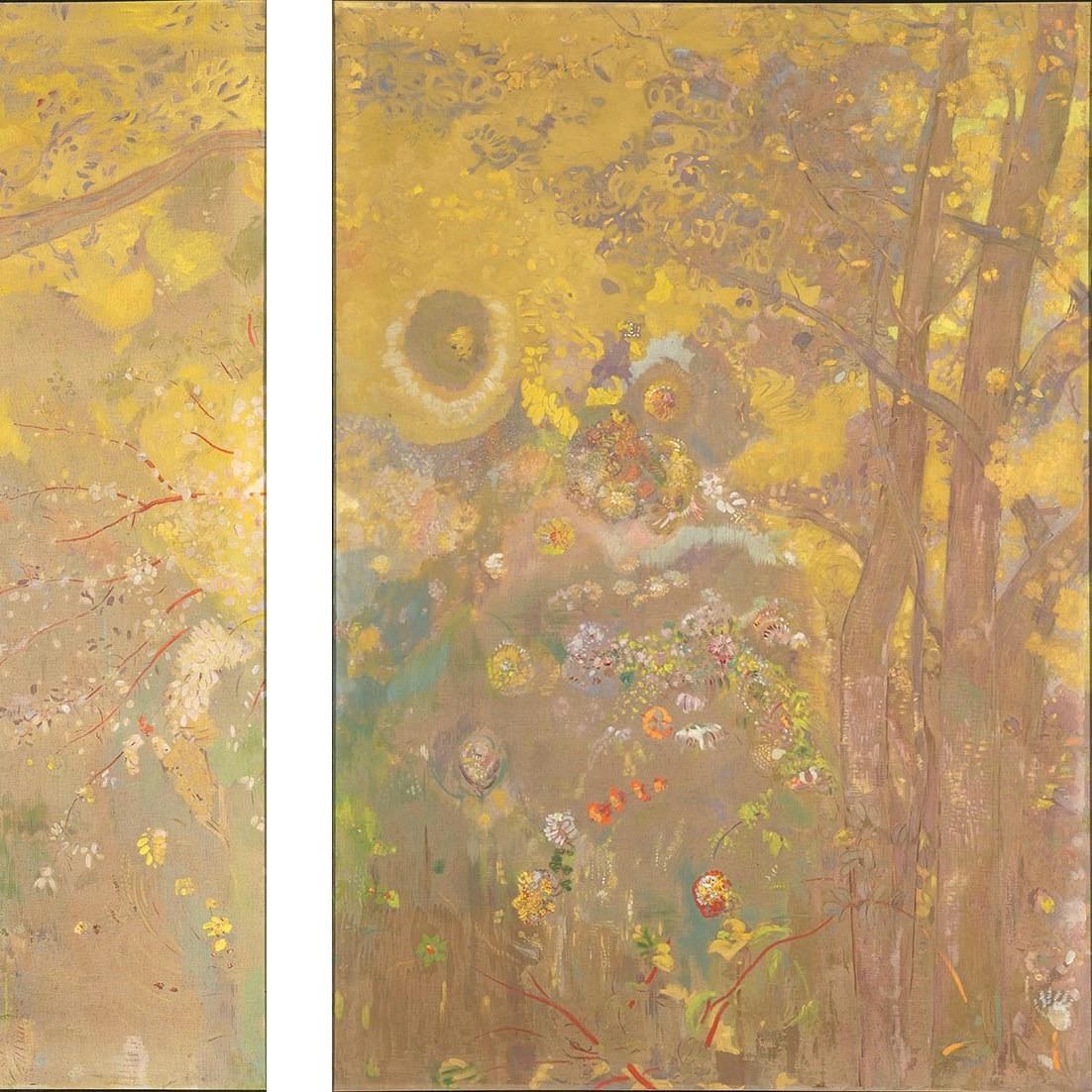 現在、三菱一号館美術館で開催されている「ルドンー夢の花園」展では、ルドンの作品の中でもとくに植物というモチーフに焦点を当てたものとなっている。その見どころのひとつは、この《グラン・ブーケ》を含むドムシー城の装飾パネルがすべて揃うことにある。なぜ《グラン・ブーケ》は、見る者を惹きつける独特の力を持っているのか。そもそも、ルドンと植物とのかかわりはどこから始まるのか。展覧会出品作の紹介とともに、それらを読み解いていこう。