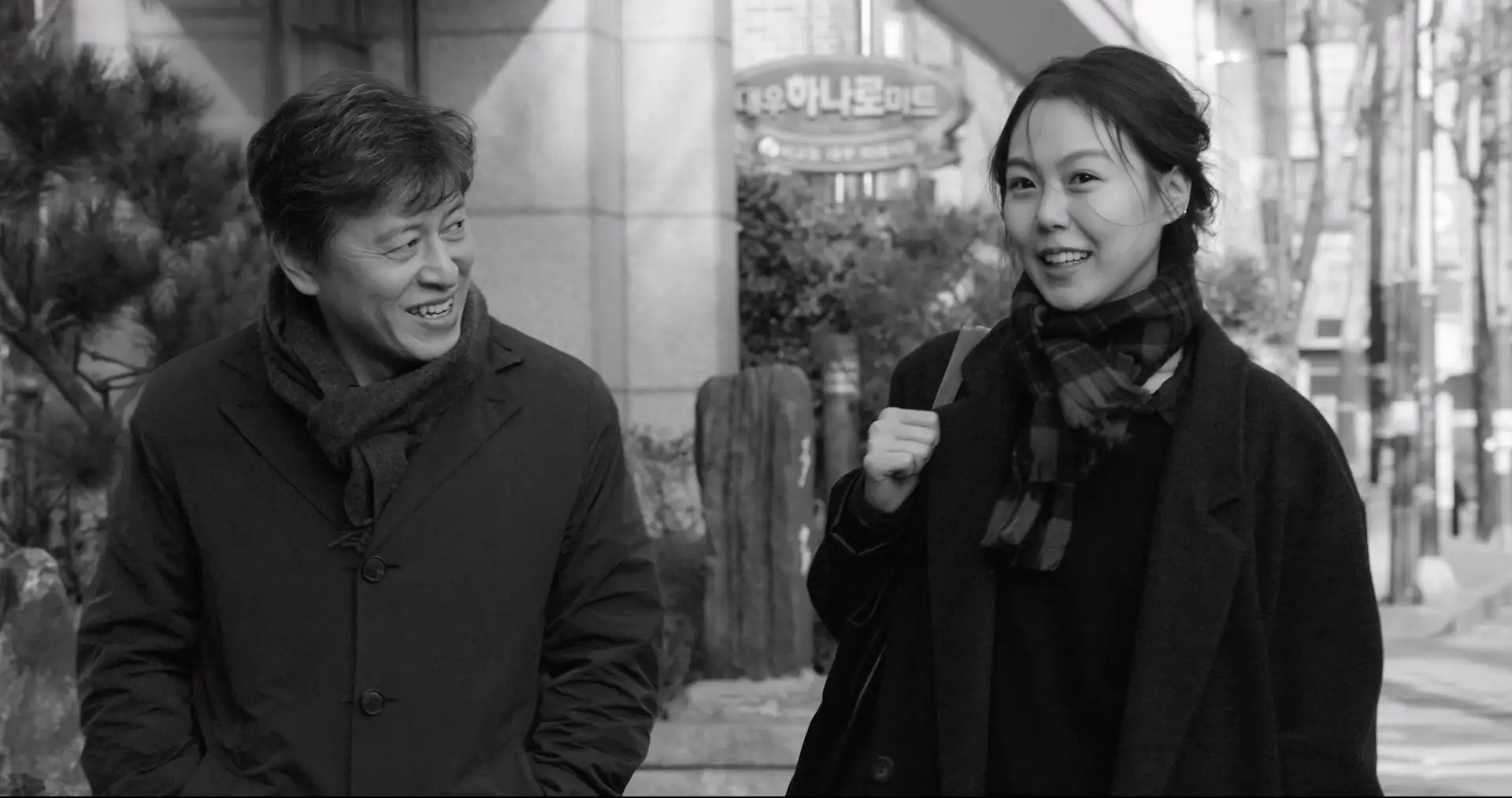 いよいよ最後、唯一のモノクロ作品『それから』(2017)で全体がまとまる。前半はいかにもホン・サンスらしいつくりだ。たったひとりの女性社員との不倫関係にある/あった極小出版社の社長(クォン・ヘヒョ)のどんどん増幅していく愛情と突然のもつれ(いつ別れたかは明確には示されていない)、相手(キム・セビョク)の退職からくる苦しみが、少しだけ過去の時間軸が行ったり来たりする、とある公園の往復や通勤シーンの断片の細かなコラージュによってシリアスに表現されている。同時に進んでいく「いま」では新しい、超優秀な社員(キム・ミニ)の入社初日を迎え心機一転と相成りそうになるのだが、奇しくも不倫相手が一ヶ月ぶりに姿を現し、「やっぱり忘れられない」とばかりに2人は強く抱き合う。それを新入社員に見つかってから、シリアスな映画は一変し、時間軸も正常になり、完全なコメディへと切り替わってしまうのだ。ちなみに、その後のキム・ミニの社長に対する呆れ顔たるや、あまりにリアルで感動すら覚えてしまうので要注目。しかし当然、調子は何も変わらない。余計なものを足したり、一般的なコメディにありがちな過度な派手さはなく、あくまでホン・サンスであり続ける。登場人物の演技力と巧みな構成力によってのみ起こした滑らかな転換は、ホン・サンスの新しい妙である。