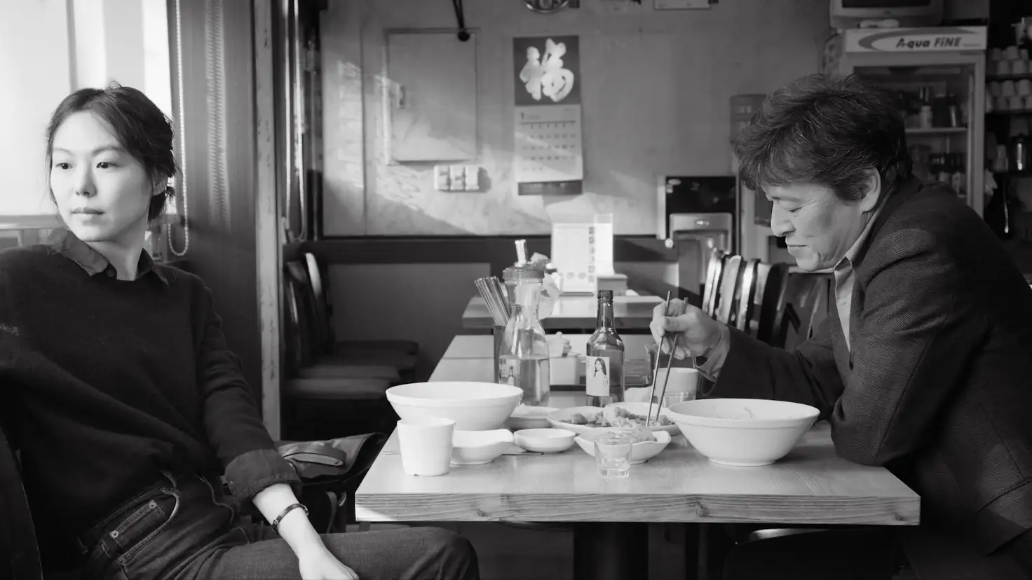 まずは『クレアのカメラ』(2017)。舞台はカンヌで、ある韓国の映画監督(チョン・ジニョン)の作品が映画祭で上映される予定になっている。キム・ミニはその監督の恋人が社長(チャン・ミヒ)を務めている会社のベテラン社員、マニを演じている。マニは他の社員から篤く信頼されているのだが、監督と火遊びをしていることが知られてしまい、カンヌ滞在中にもかかわらず急に解雇されてしまう。途方に暮れ、街中をブラブラしている間に出会い、心の支えとなるのが音楽教師のフランス人、クレア(イザベル・ユペール)だ。彼女は写真を撮ることが趣味で、出会った人のポートレートをポラロイドカメラで収め続けている。その写真が媒介となり、監督と社長、そしてマニを再び結び付けるというのが、大まかなストーリーである。構成はシンプル。制作期間が数日で、尺も70分弱と他と比べるとやや短い。脚本、筋書きが一切ないところでつくられた即興性が高い、快活なイザベル・ユペールが功を奏するホン・サンス入門に相応しい良作だ。しかし、ホン・サンス作品を見慣れている人にとってはやや物足りなさを覚えるかもしれない。