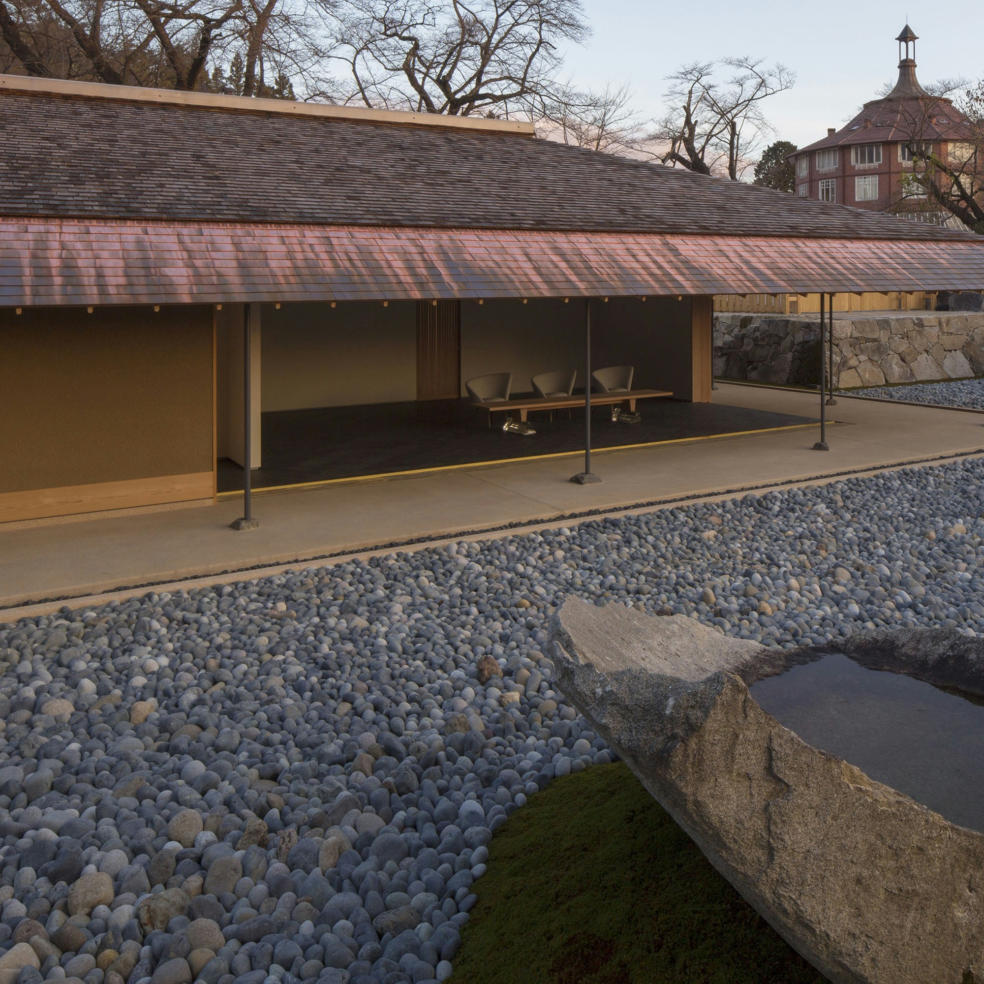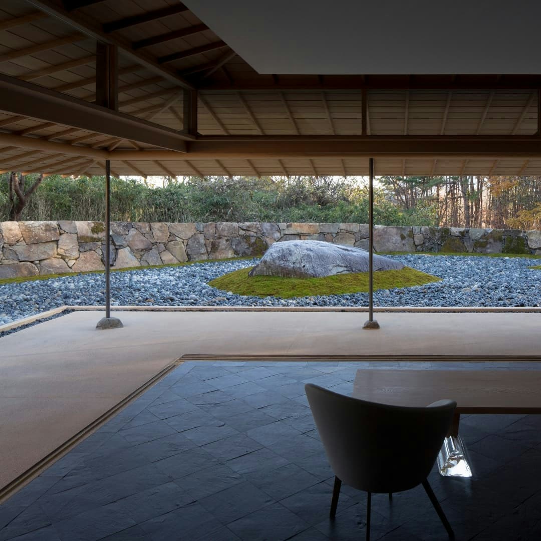 そんな同地に今年4月、新素材研究所(杉本博司+榊田倫之)が設計を手がけたゲストハウス「和心」が誕生した。平屋建ての「和心」には敷瓦や福島から切り出された巨石が用いられ、随所に杉本の美意識を見ることができる。