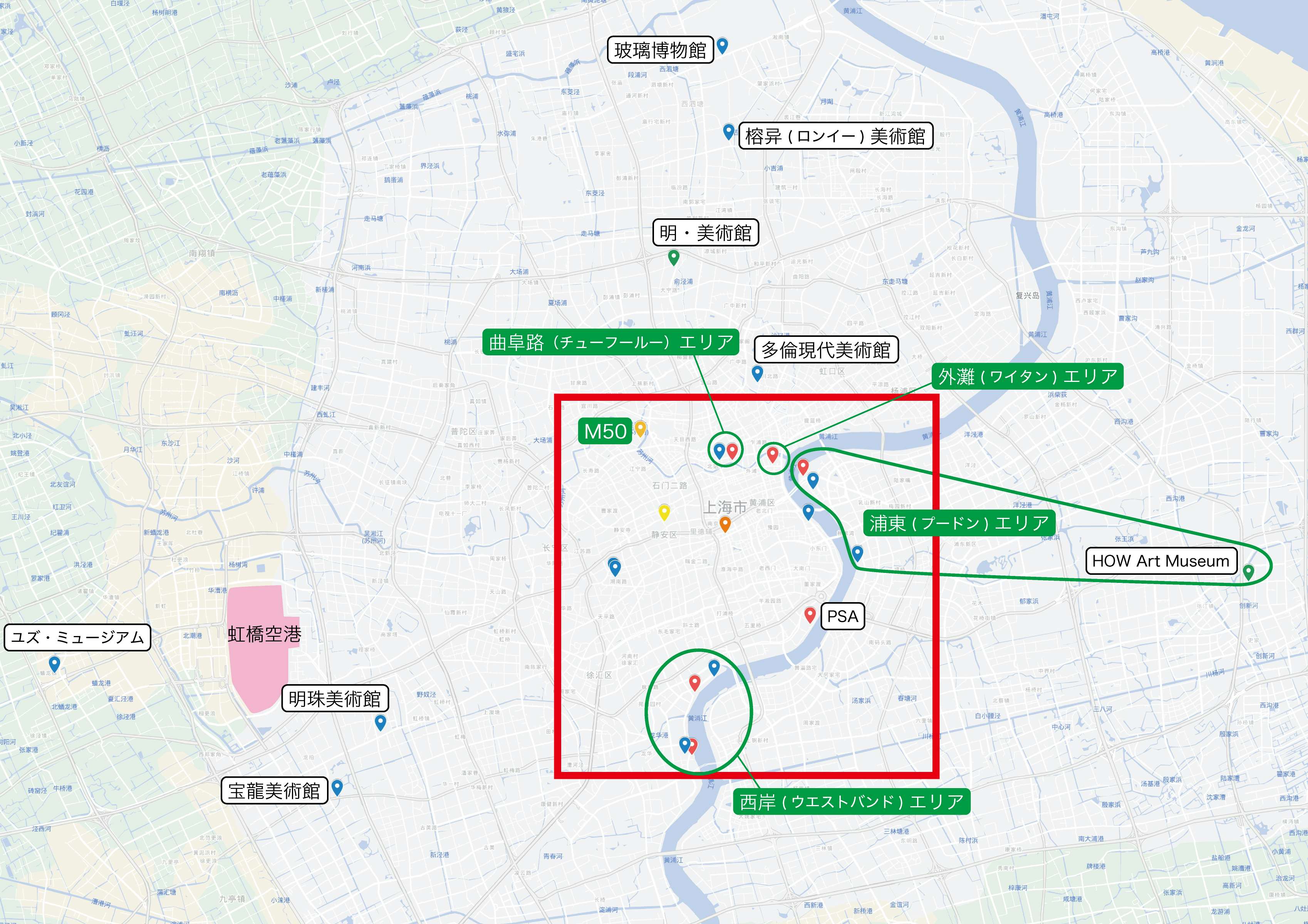 上海アートマップ2023*複数が集中しているエリアは代表して1〜2施設のみ表示しています(2023年11月7日、筆者作成]