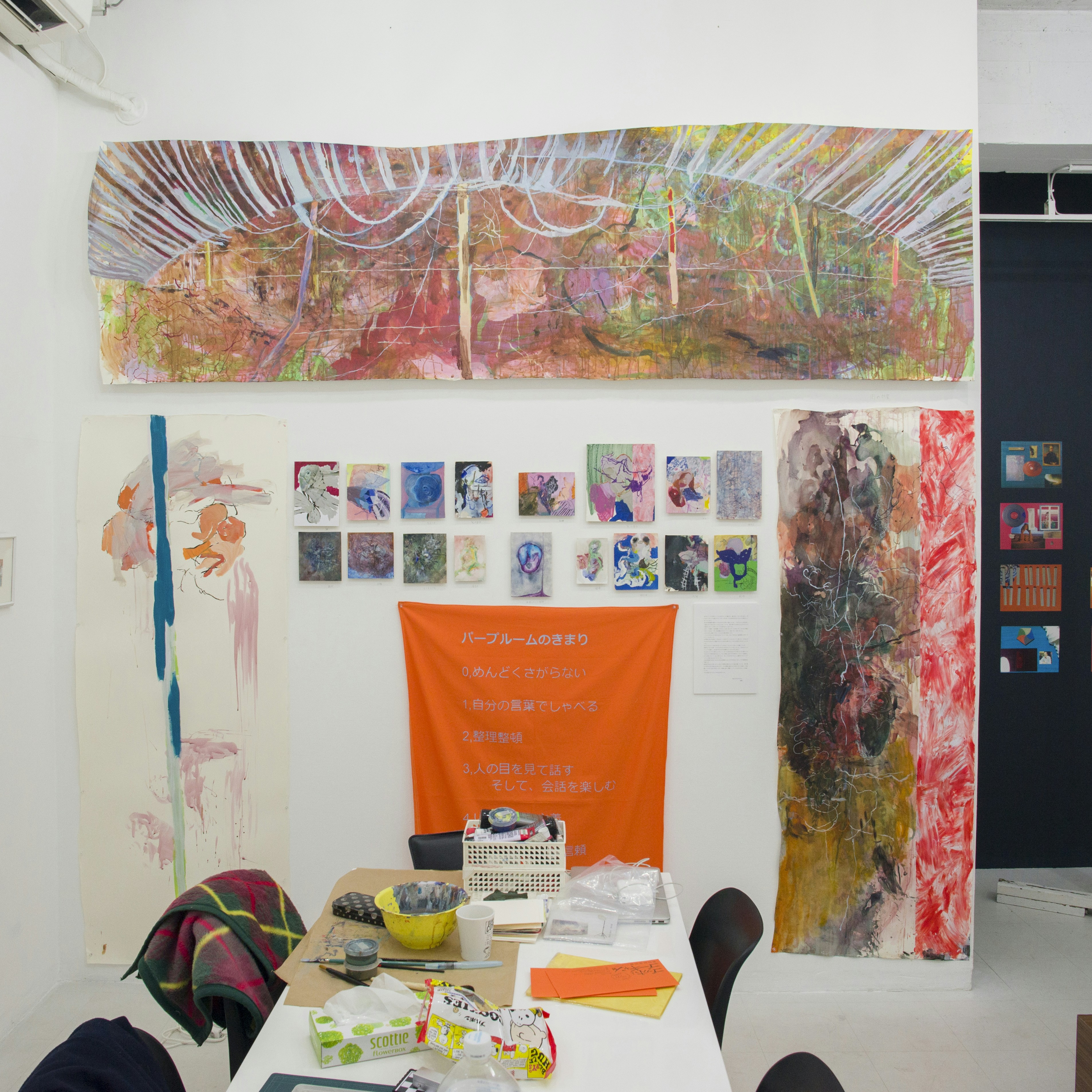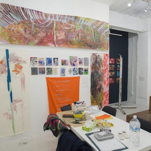 さらに、3番目に開かれたYEBISU ART LABOでは、パープルーム予備校生たちの作品が展示されるのみならず、会場に彼らが日々寝泊まりし、開廊中もドローイングを描くなどして留まり続けた。彼らの生々しい生活の手触りが生活と制作、展示の境目をなくし、その結果、会場には、日常生活と地続きの親密さとそこに他人が侵入する緊張感が充溢していた。