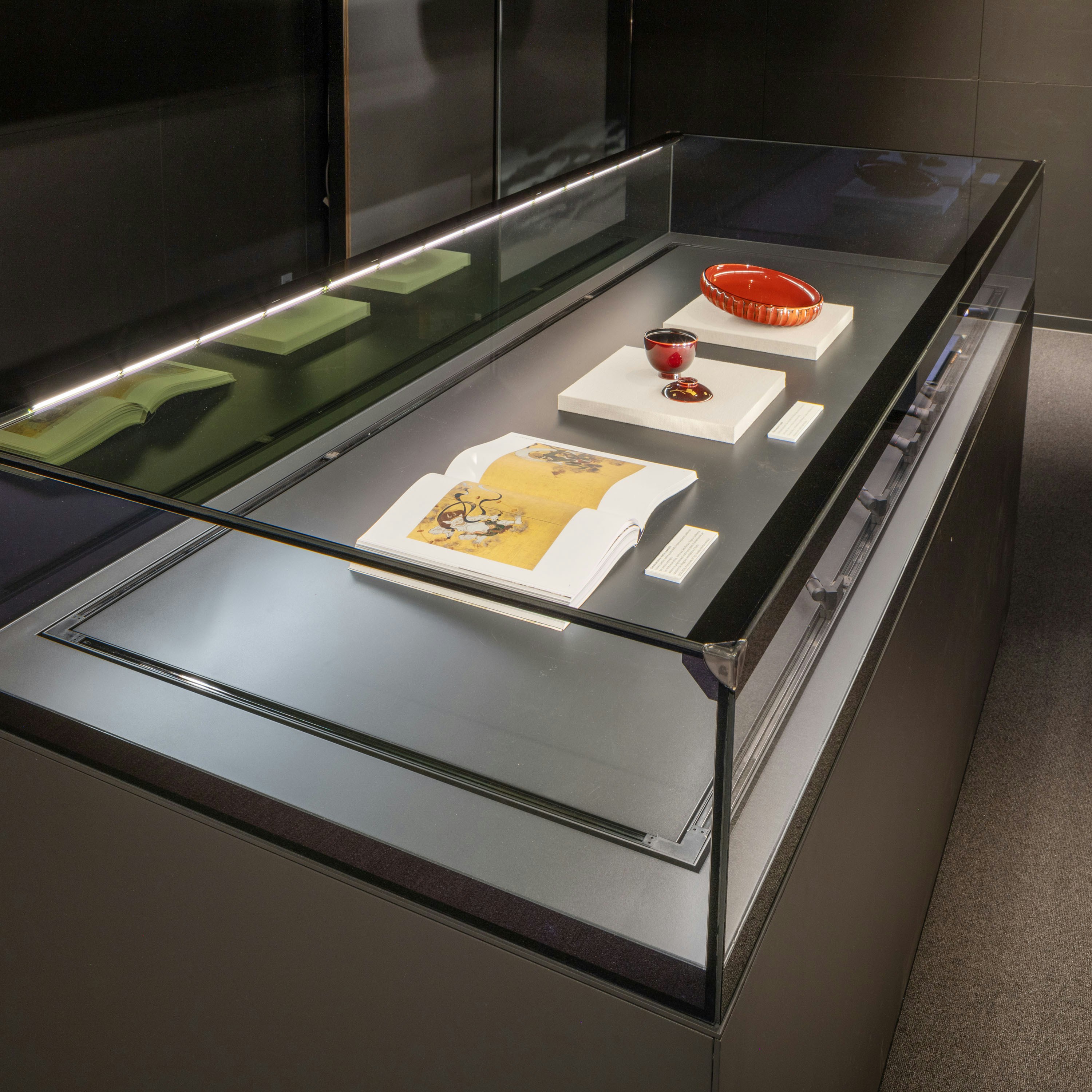 「展示ケースの使命は展示品を際立たせること。それ自体が高いデザイン性と工作精度を有しつつ、展示品を引き立てる黒子的な役割が求められます。ガラスは透明性の高いラミネートガラスに低反射コーティングを施し、美術工芸品の本来の美しさを引き出せるようになっています。またテーブル型は、学芸員の仕事のしやすさと作品の安全を考慮して、開口部を大きく取った電動の開閉機構を持ちます。