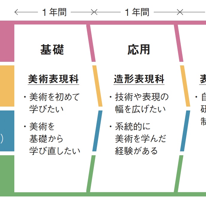 入学時に、4つの専門コースと、「美術表現科」「造形表現科」「表現研究科」の3つの学科から1つずつ選択する。「美術表現科」は美術を初めて学ぶ人や基礎を学び直したい人、「造形表現科」はすでに美術を学んだことのある人が対象。自らの表現をさらに探究したい場合は「表現研究科」だ。
