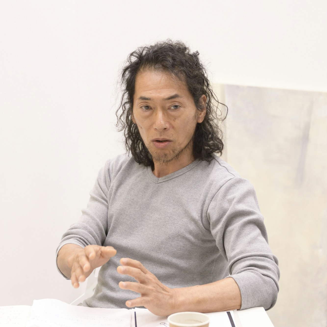 銀座四丁目の佐谷画廊に入ったときは、まず空気が違うと感じたね。その当時、俺は《絵画=空》を描いている途中だったけど、それをどこかで発表するなんて頭はこれっぽっちもなかった。でも、その絵が周囲の白い空間によって初めて成立するっていうビジョンは頭の中にあった。すごく白いきれいな壁に絵がかかっていて、「せんせい」がそこに見に来てくれるというビジョンだね。だけど、具体的にそれがどういうことなのかはわからなかった。でも佐谷画廊で初めて「あ、これが俺のイメージしていた白い壁だ」って感じたし、個展に臨もうと思ったんだ。