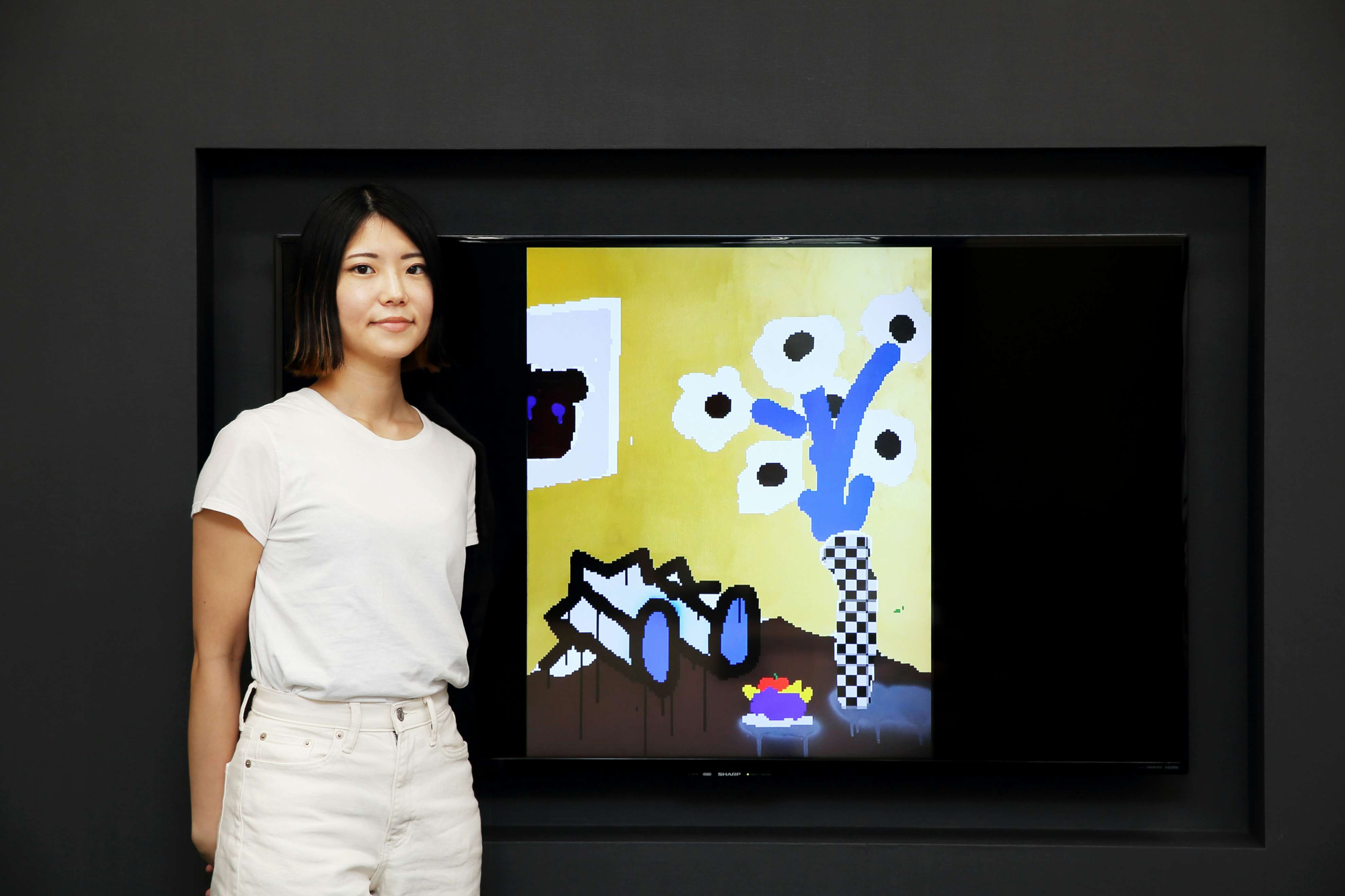 HINと、SHIBUYA PIXEL ART CONTEST 2019で「Beyond Pixel Art賞」を受賞した絵画作品《untitled》(取材時にはディスプレイに表示)