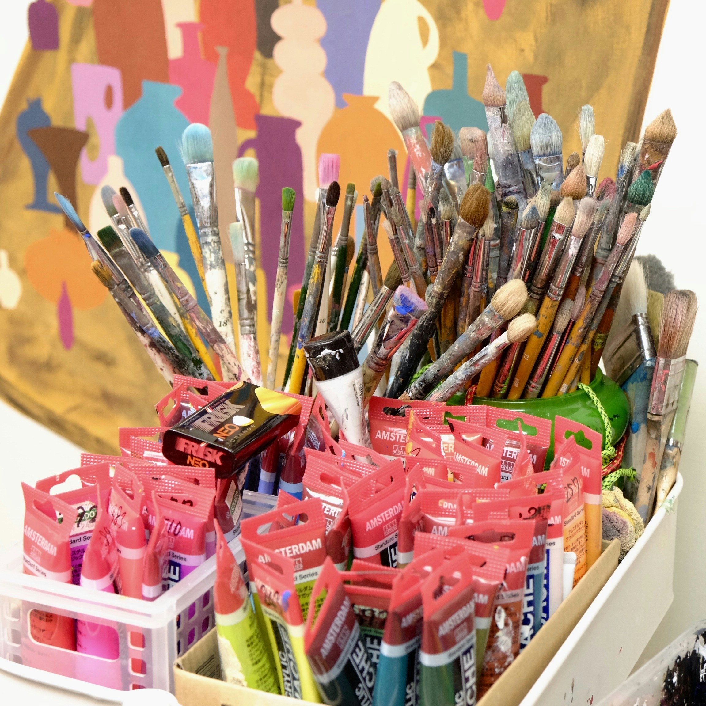 キャンバスを壁面に貼って描くことで、筆に圧がかけられるんですよね。木枠にキャンバスを貼ってから描くと弾力を持ってしまって、それがあまり好きじゃないんです。使用するブラシも多種を使い分けていて、なかには強く押しつけて描くものも結構ありますし、その場合は毛先をカットした強いものを使用します。