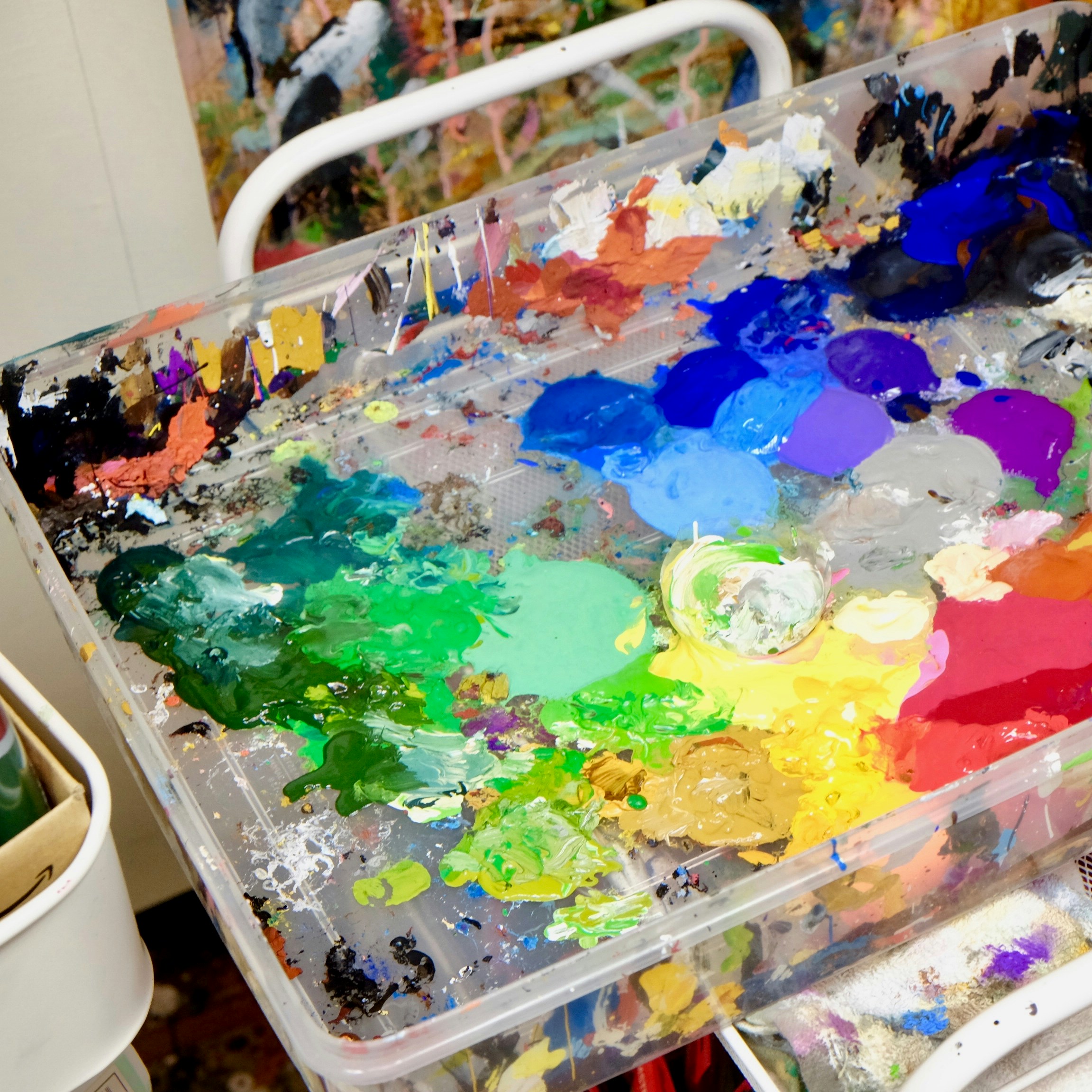 絵画の景色のなかで色をつなげていくために、筆をあまり洗わないようにしています。水も、1枚を描ききるまで変えないほうが、全体でまとまったトーンになります。イラストに近づいてしまうのが一番怖いんですよね。パレットも、売っているなかで一番大きいサイズのタッパーを使っていて、描いているうちに混ざり合い、1色になっていきます。