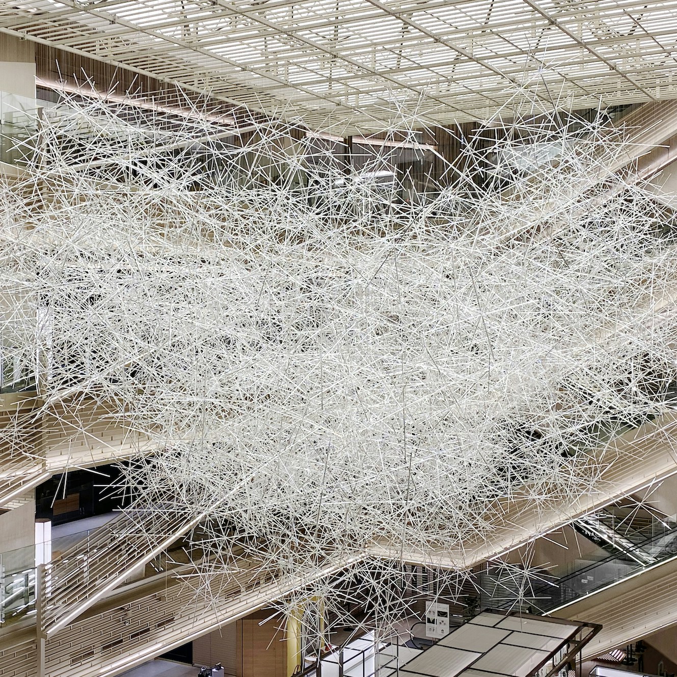 2017年の開業以来、草間彌生をはじめ、ニコラ・ビュフ、ダニエル・ビュレン、塩田千春といった国際的なアーティストたちが作品を発表してきたGINZA SIXの巨大な吹き抜け空間。20年2月、ここに吉岡徳仁による《Prismatic Cloud》が登場した(展示は2月下旬まで)。