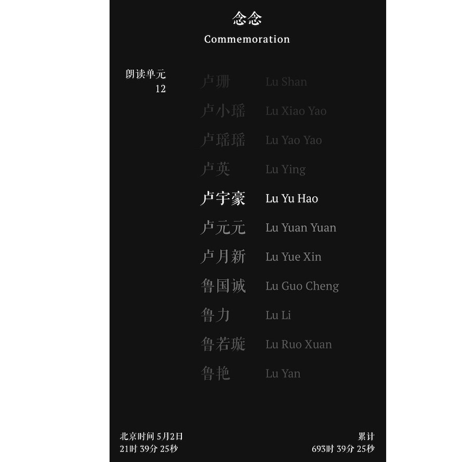 期間は4月4日の清明節から、地震の起きた5月12日までの全部で39日間です。私たちはルームの管理人と副管理人をそれぞれ39名置き、8時間おきに交代しながら運営しました。私たちのチームは主にアメリカ東部、ヨーロッパ、中国大陸にあるので、ほぼ24時間カバーできるのです。合計936時間、1ユニット200人分の名前を約13分で読み上げるルールです。