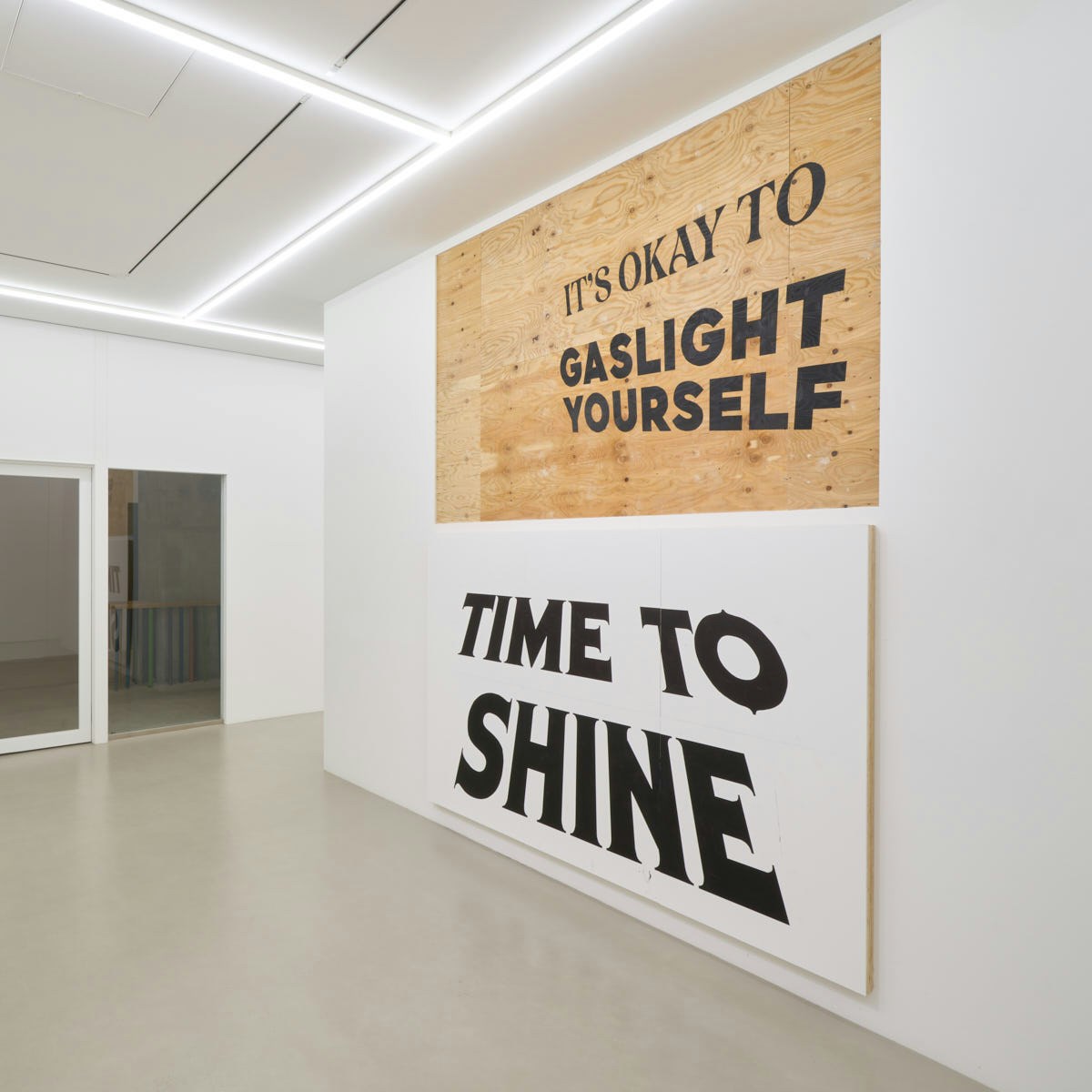 KOTARO NUKAGA(天王洲)で開催されたホーの個展「SOMETHING SO BEAUTIFUL IS SO EASILY FORGIVEN」(2023年4月8日〜6月3日)では、ギャラリーの白い壁に直接レタリングを施し、その部分が石膏ボードごと切り出されていた。石膏ボードはパネルに固定されて「タブロー」と化している。それに加えて、石膏ボードが切り出されることで露呈した壁面にも直接レタリングが施されており、本展におけるホーの作品はこの「タブロー」と「壁画」のふたつのパーツからなる全10点で構成されていた。