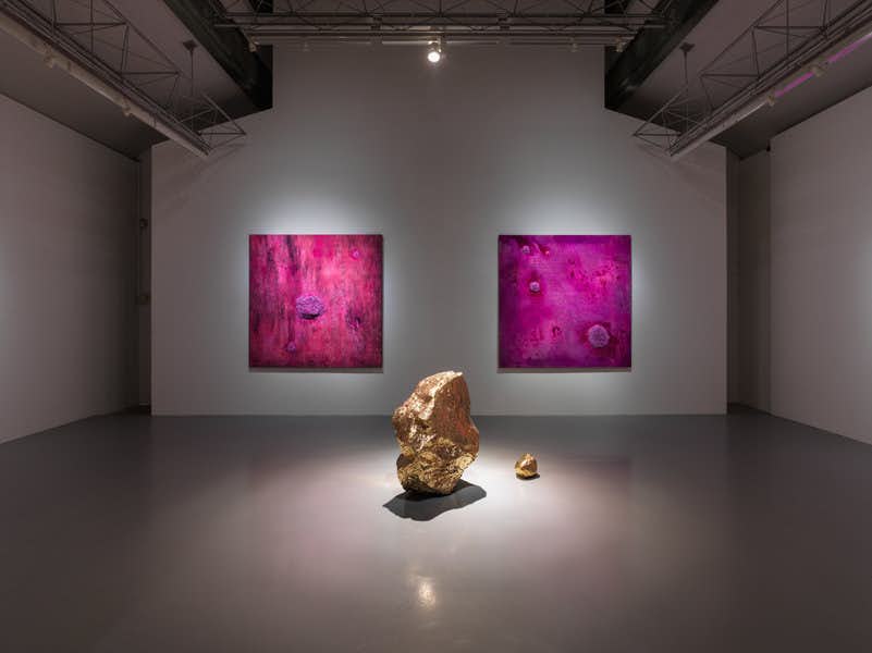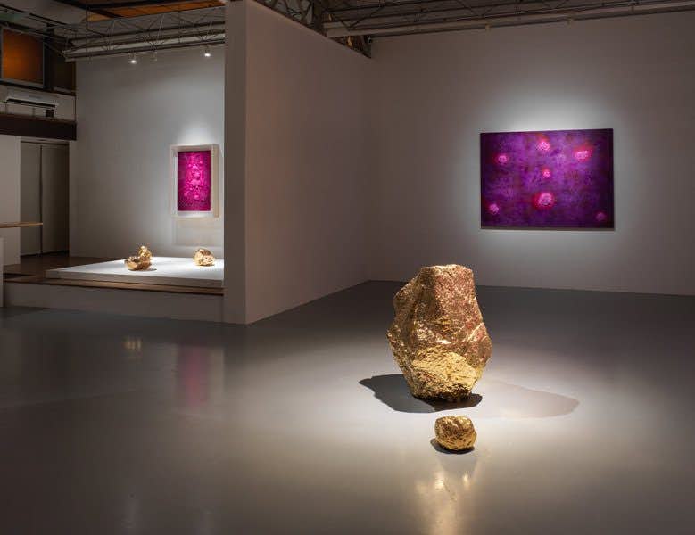 「Rhus Verniciflua」展の展示風景。立体作品が平面作品のピンク色を反射していることがわかる
