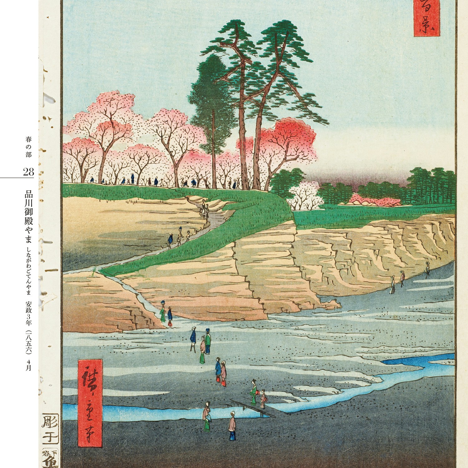 日野原 実際に現在の場所に行ってみるのも楽しみ方のひとつですが、作品の江戸の風景から、いまの東京のあり方を読み取る面白さもあります。たとえば、28番「品川御殿やま」を見てください。ここは、現在の品川駅前なのですが、当時は桜の名所で有名だった場所です。けれども、この絵は手前が崖になっているんですよ。これは、いまのお台場あたりに砲台を設置するための土台をつくるために埋め立てる土が必要で、ここを削って持って行ったからできた崖なんです。現在、お台場には砲台の跡が残っていますが、広重の絵から、当時のそんな社会情勢が読み取れるのは興味深いですね。
