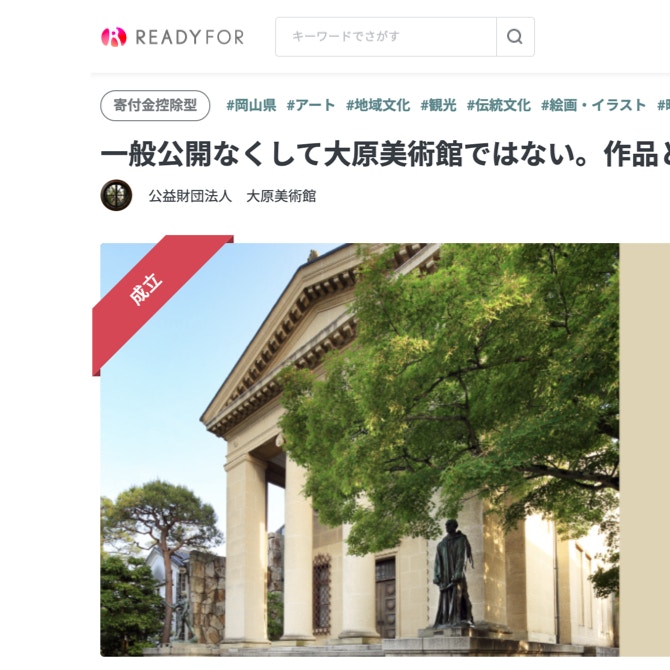そもそも、運営費をどうやってまかなうかという意識が変わりつつあるのかもしれません。非営利団体の収益源は大きく分けると事業収入・公的資金(助成金/補助金)・寄付の3本柱ですが、多くの美術館はこのどれかに偏りがちです。例えばREADYFORでプロジェクトを立ち上げた山種美術館も大原美術館(いずれも私立)も、ベースはチケット収入(事業収入)で、コロナ禍で休館や入場制限がかかると軒並み大変な状況になっています。いっぽう、公立館はほとんど公的資金で運営されていて、自治体の予算が運営に大きな影響を与えます。収益源の3本柱のバランスが取れていればどれかが凹んだときもリカバリーしやすいですが、そうなっているところは少ない。とくに寄付は柱のひとつとしてあまり重視されていなかったと言えます。