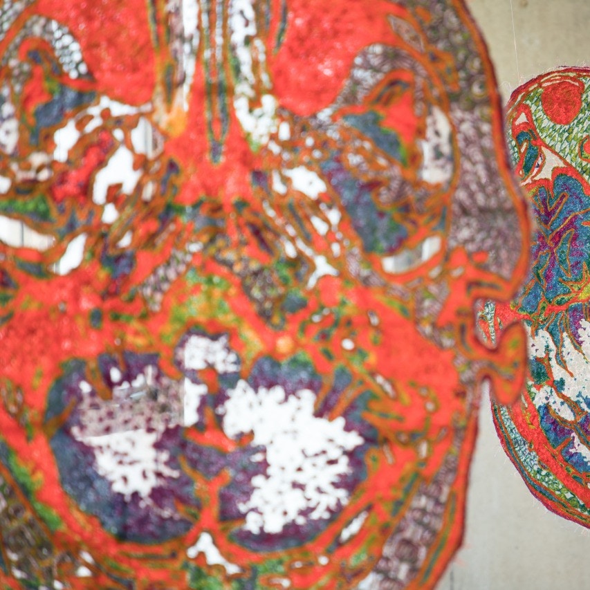 ミシンのプログラミングにあえてバグを加えることで想定外の美しさが生まれることに着目した刺繍作品を手がける宮田彩加。針の動きによって糸が織りなす範囲が広がる様子から細胞の増殖を連想し、エルンスト・ヘッケルの生物標本やMRI画像などをモチーフに制作してきた経緯がある。KYOTO STEAMで企業と協働するのであれば、これまで標本や二次元のデータでしか知ることのできなかった動植物のモチーフを、生きた状態で観察して触れることができないかと考えて株式会社SeedBankを作品プランに選んだ。