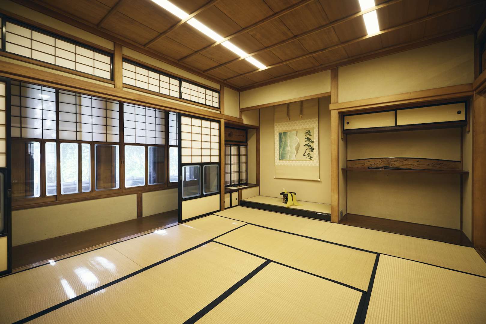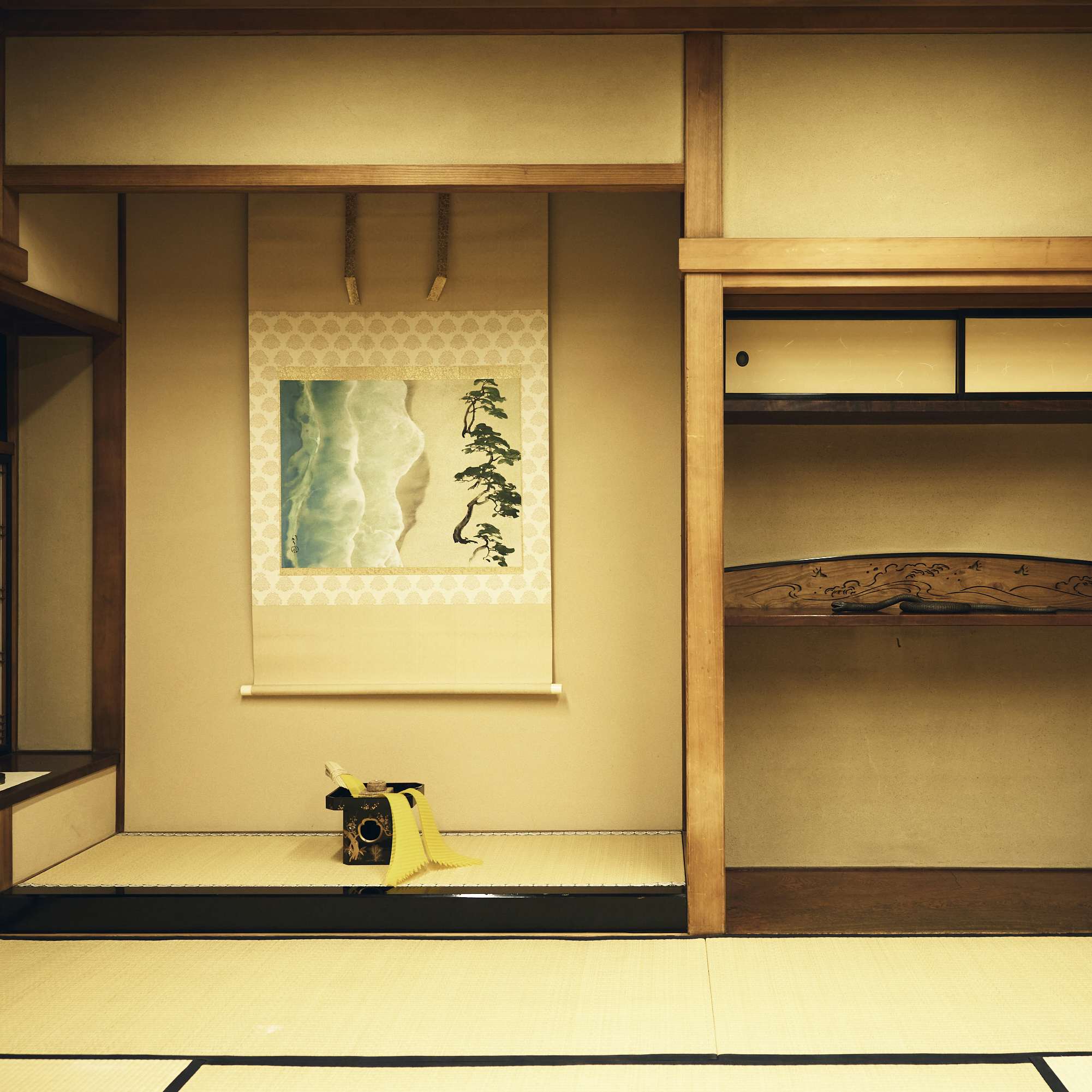 小西哲哉(以下、小西) 床の間に飾ったのが、波打ち際を真上から俯瞰した図と横から見た松を平面に落とし込んだ、川端龍子の《浜松図》という掛け軸です。キュビズムのようですが、アメリカのフリーア美術館が所蔵する俵屋宗達の《松島図屏風》に見る松の描き方と似ているので、おそらく龍子はそうした作品から着想を得て描いた絵ではないかと思われます。その下に、正月なのでのし飾りをさせてもらっていますが、のし押さえに使っているのは、川瀬忍さんという現代の陶芸家による作品です。2009年から12年ほどかけて薬師寺の東塔が改修されたのですが、その礎となる石の下の「基壇の土」をいただいて焼いたものです。つまり、1300年前の天平時代の土が用いられています。