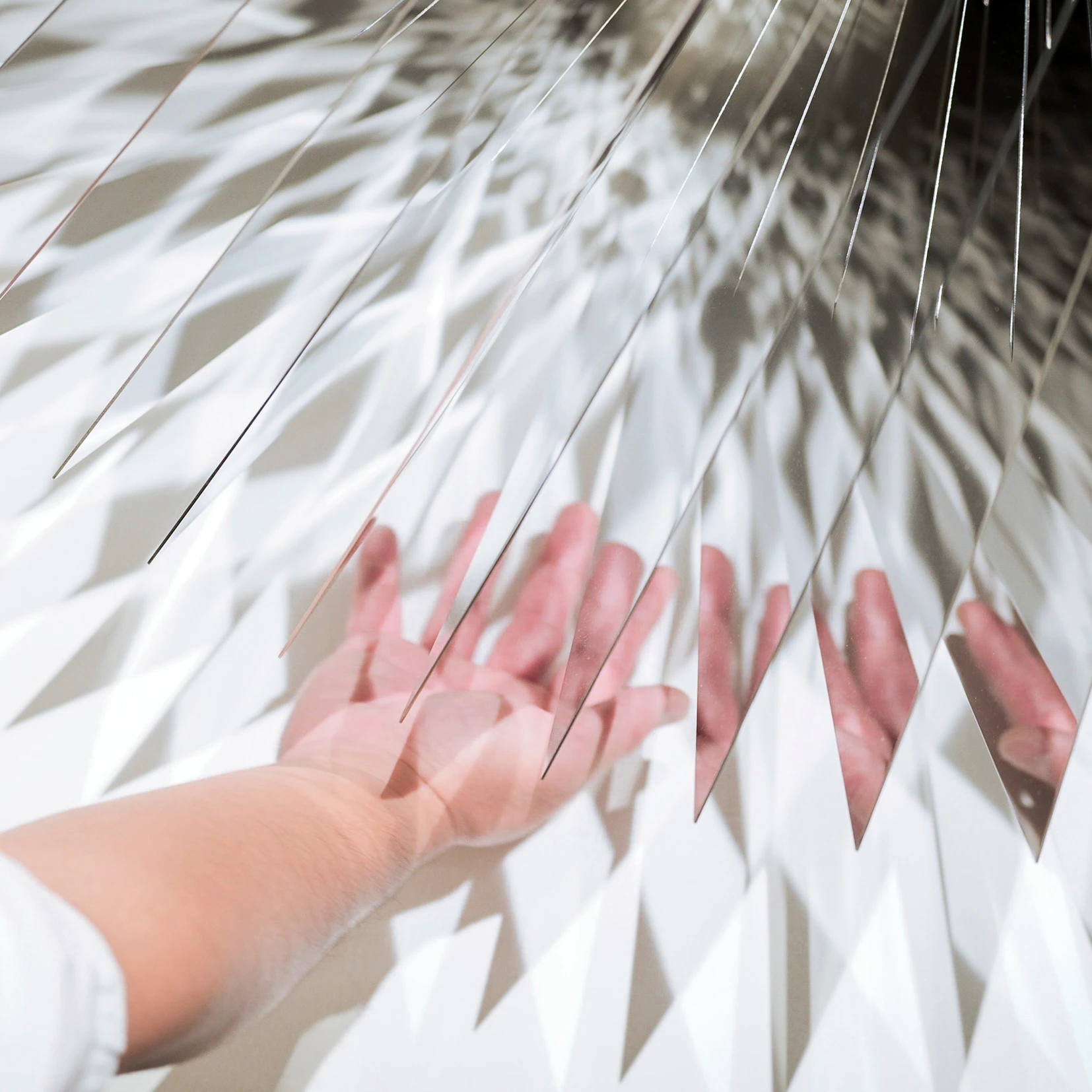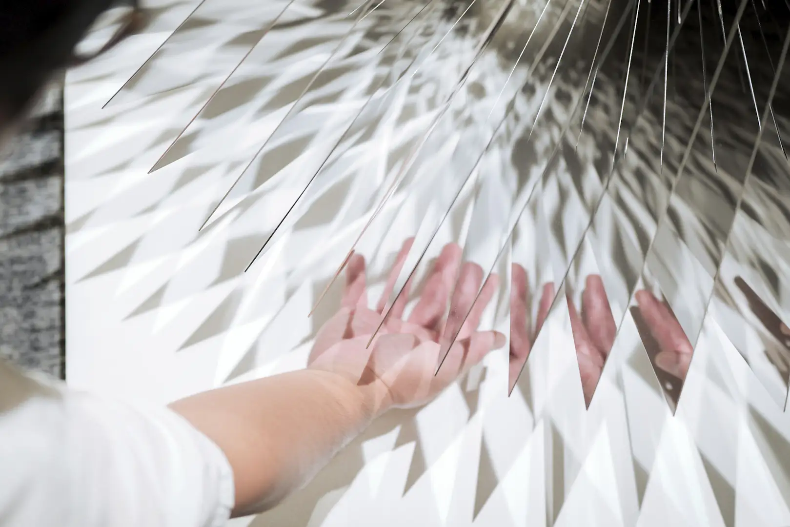 アメリカのオレゴン州にクレーター・レイクというカルデラの中に山頂が浮かぶ湖があり、ネットでそれを見つけたとき、あまりにも美しくて強く心を惹かれました。どうしてこのような湖になったのかという由来を調べながら、様々な出来事が関連しあった結果として、こうした情景がかたちづくられていくという、その過程に興味を持ちました。受賞作の《Dancing Rays−Sequence of Events/光之舞歩−事件軌跡》(2025)は、こうした連関の構造を表現した作品です。タイトルでも、無数の出来事の連鎖によって世界がかたちづくられており、私たちはその連鎖の一部として存在しているということをうたっています。