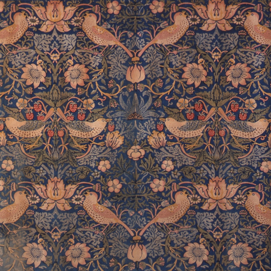 ウィリアム・モリス(1834〜1896)は19世紀イギリスを代表するデザイナー・詩人。思想家ジョン・ラスキンの影響を受け、産業革命によってもたらされた芸術の機械化、量産化に反発し、ロセッティ、バーン=ジョーンズらとともに「生活と芸術の一致」を唱え、アーツ・アンド・クラフツ運動を進めた。