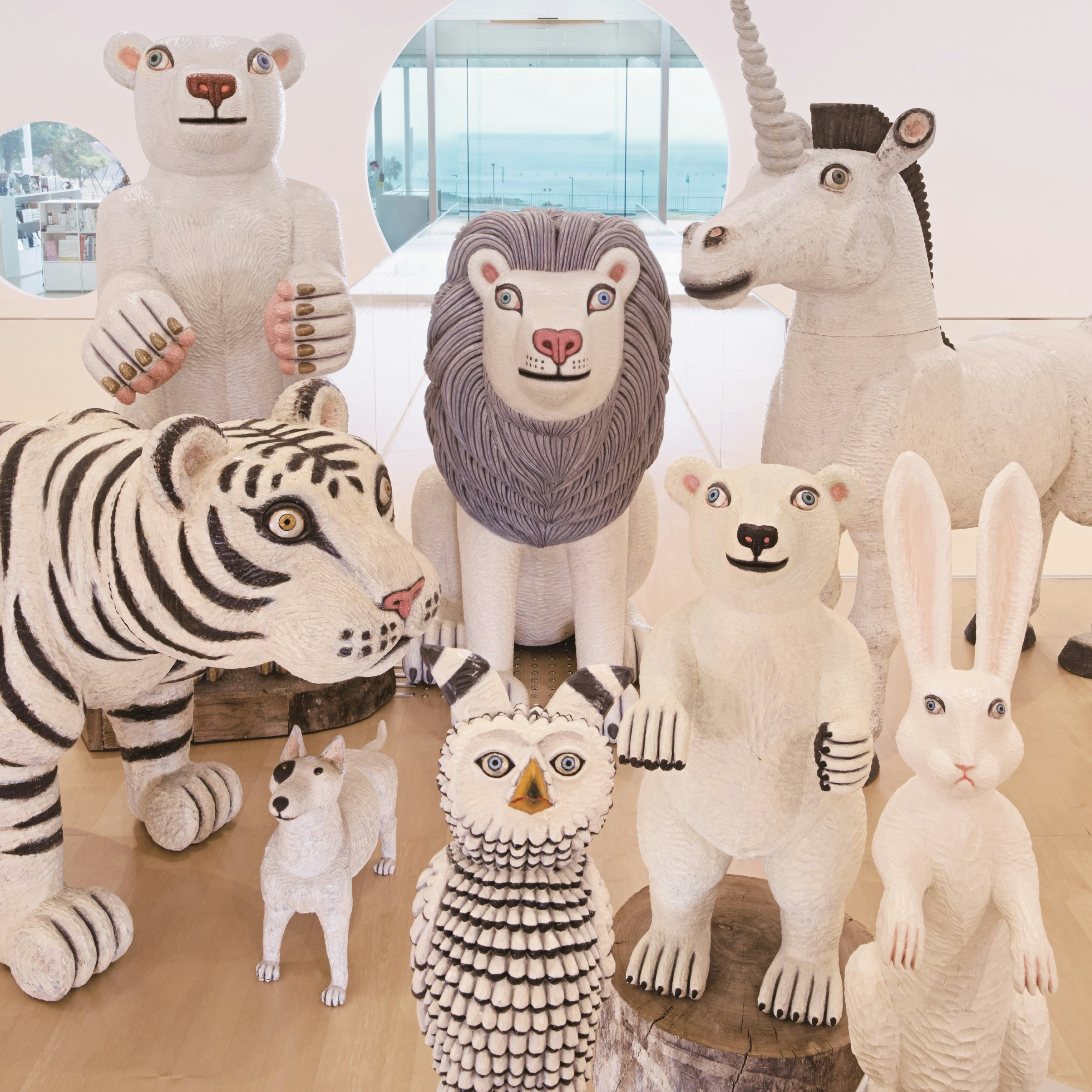 様々な動物をほぼ原寸大で彫りだして彩色した作品は、非再現的な独自の動物表現により新たなリアリティを提示するとともに、見る者の記憶やイメージを喚起し創造的な鑑賞へと導く。
