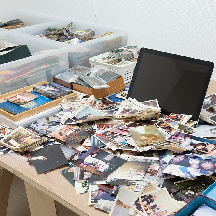 原田は2012年より「心霊写真」のプロジェクトに着手し、17年以降は、産廃業者や古物商らとともに写真捜索の活動をスタート。いつ・誰によって撮られたかがわらからない1万枚弱(2018年4月時点)の写真の山は、現在進行系でその規模を拡大させ続けている。