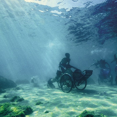 そのほかにも、自動車や家電を用いたサウンド・スカルプチャー《プライウッド新地》で動く都市をつくる宇治野宗輝、伝統的な琉球着にジュゴンや軍事用ドローン、沖縄の人々といったモチーフを染めあげた《遥か遠くからの未来より》を提示する照屋勇賢などが参加。