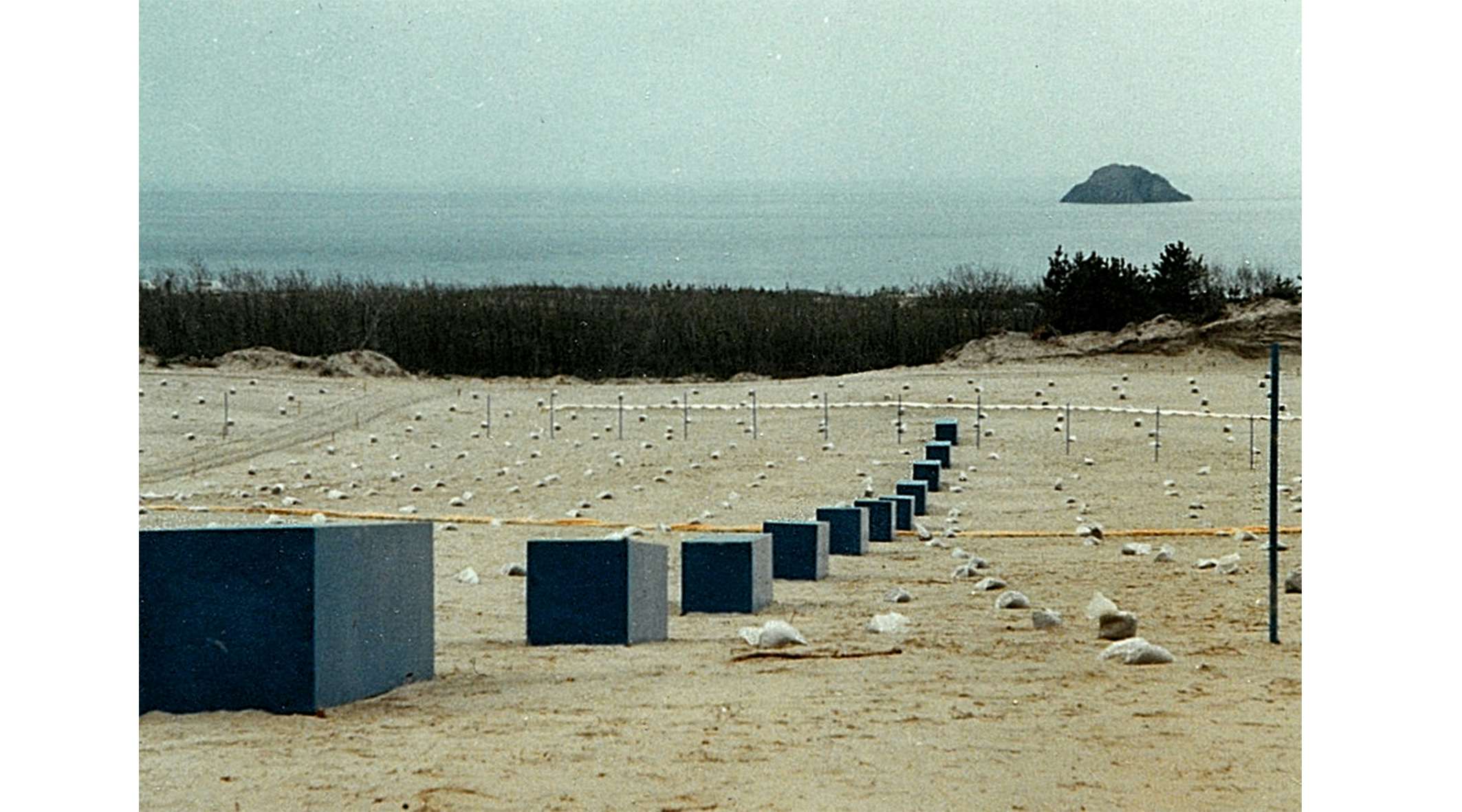 「カメラリポート」のための作品 岩戸海岸での展示風景 1976