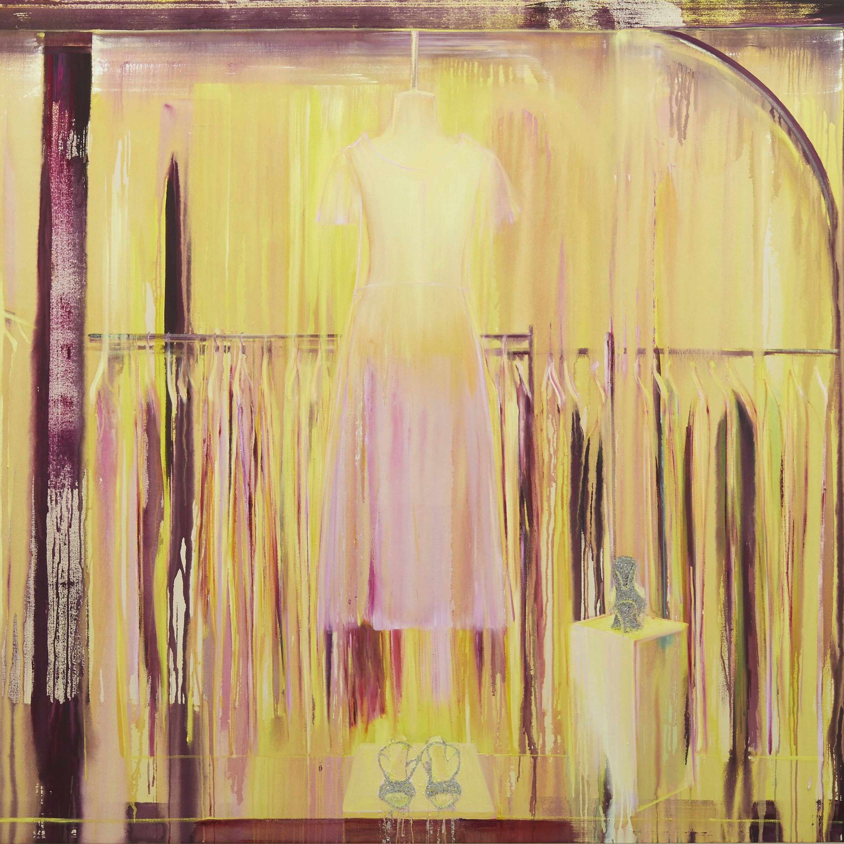 ガラス壁から自然光が差し込む開放的なポーラ美術館の展示空間にインスピレーションを受けたという佐藤は、これまでの閉ざされた室内を描いた「クローゼットシリーズ」から一転し、ファッションアイテムがひしめくショーウインドウを描いた《Diaphanous pink window I》(2019)で、やわらかな光で満たされた空間を描きだした。ショーウインドウの衣服は、計算された構図のなかで浮遊感を漂わせている。いっぽう、佐藤がこれまで連作として描いてきた花やカーペットをモチーフにした作品《Bouquet of roses I》(2019)では、装飾性と、静物画のような古典的な要素が見だされる。