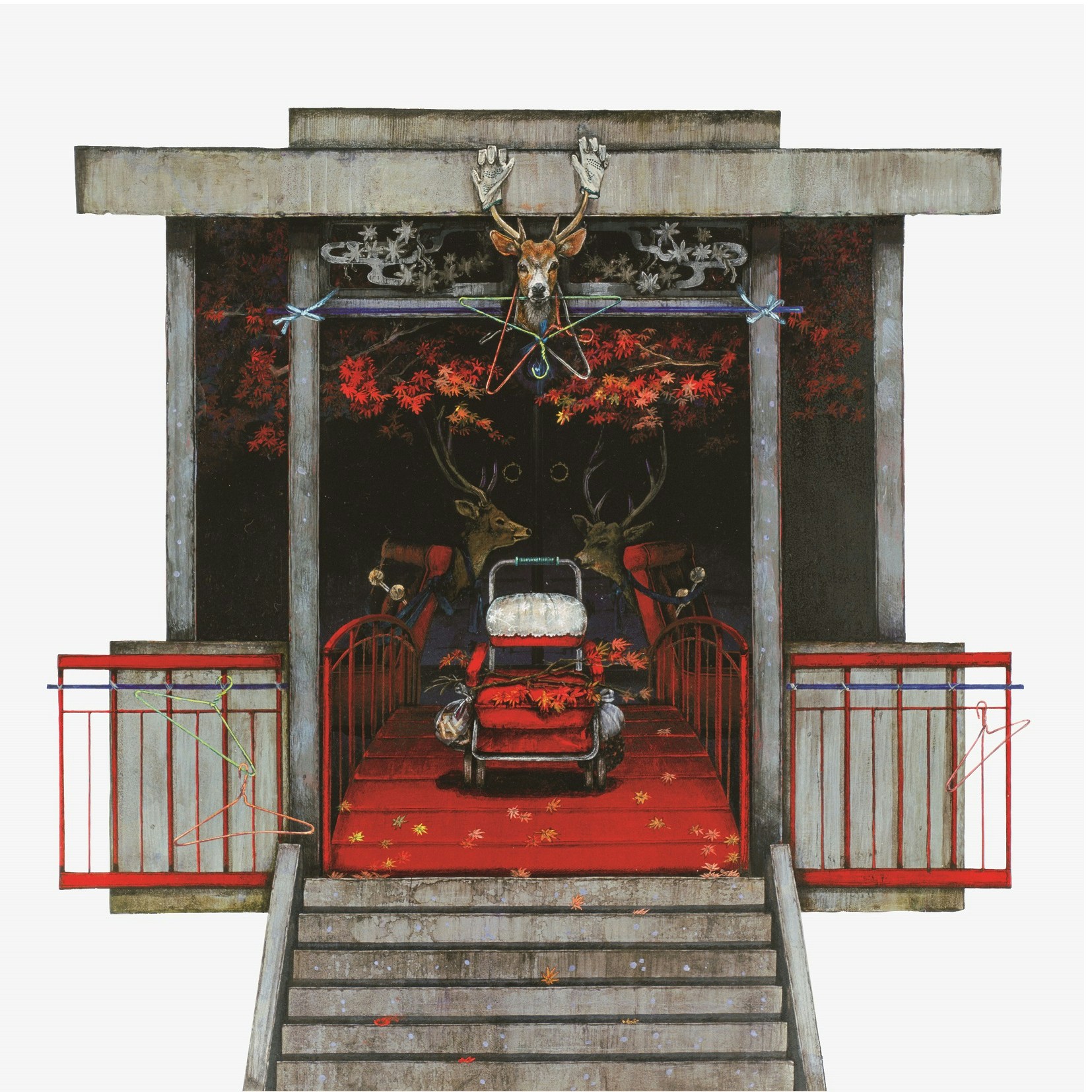 やがて齋藤は、花のモチーフから離れ、自身が幼少期を過ごした団地での記憶をもとに、箱型の団地の窓を描く一連のシリーズに着手。《晒野団地四畳半詣(さらしのだんちよじょうはんもうで)》(2006)では、窓枠の奥に人々の気配を描いていたが、近年では、窓の内の居住者への観察眼を外へ向け、日本各地で旅を重ねながらイメージを収集しているという。