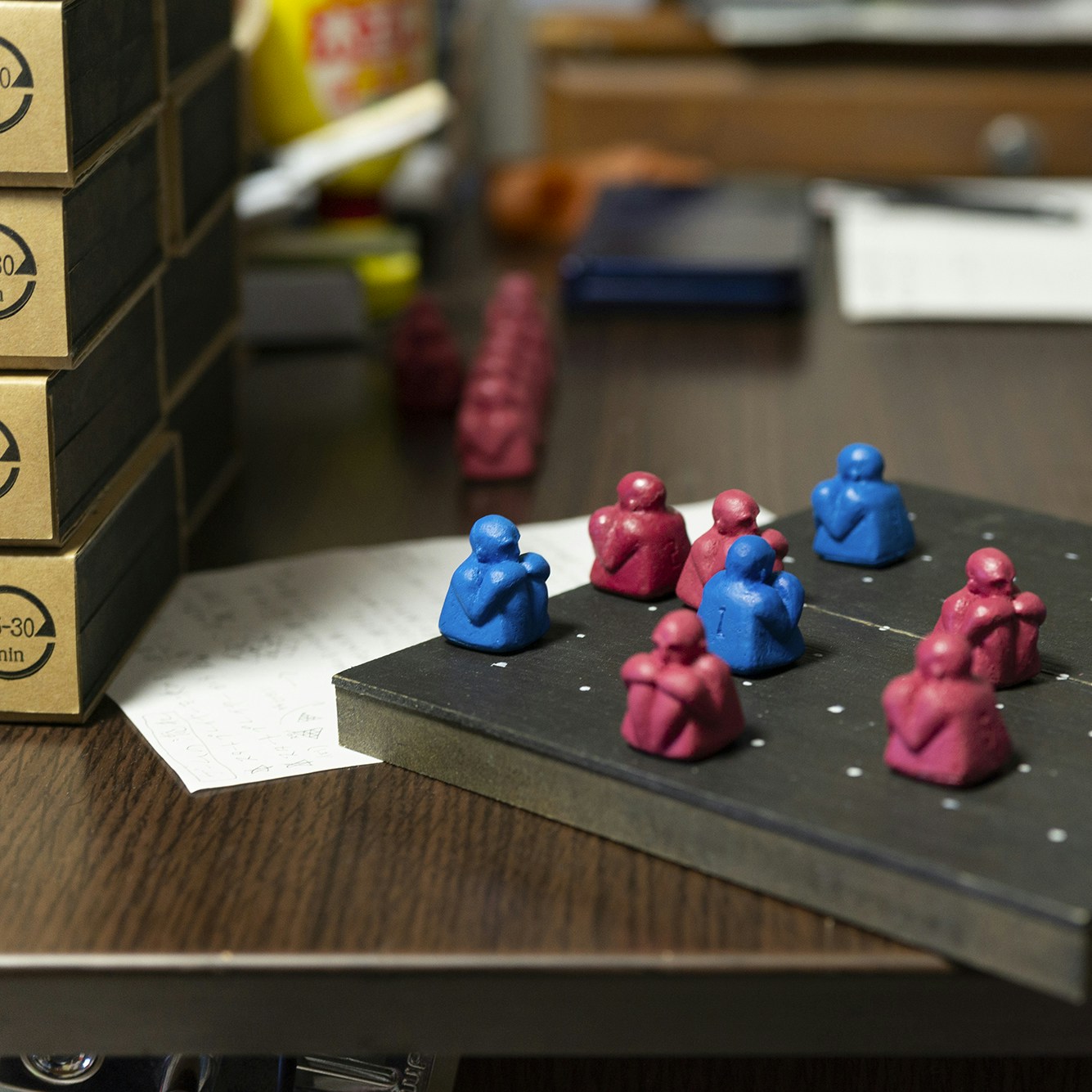 アランは自ら開発したボードゲーム「ゾンビマスター」において、ゲーム道具とプレイヤーのあいだのコミュニケーション不全にフォーカス。ゲームの状態変化が複雑になるにつれて指し手の検討がより難しくなり、プレイヤーが思い通りに駒をコントロールできていない感覚を抱くような状況を構築する。
