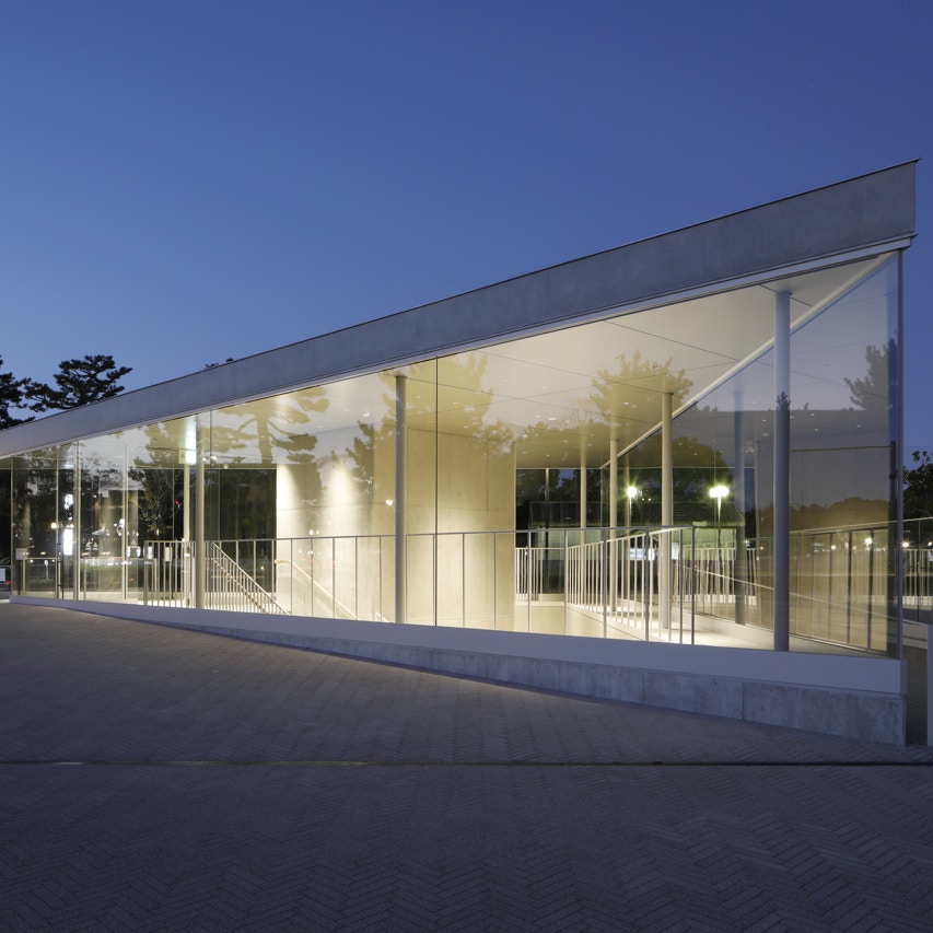 ザ・トライアングルは、今回の改修で新たに生まれたスロープ状の広場「京セラスクエア」に突き出たガラス張りの北西エントランスと、地下に位置する展示スペース。ここは、新進の現代作家の作品を中心に展示するギャラリー空間として機能する(入場無料)。