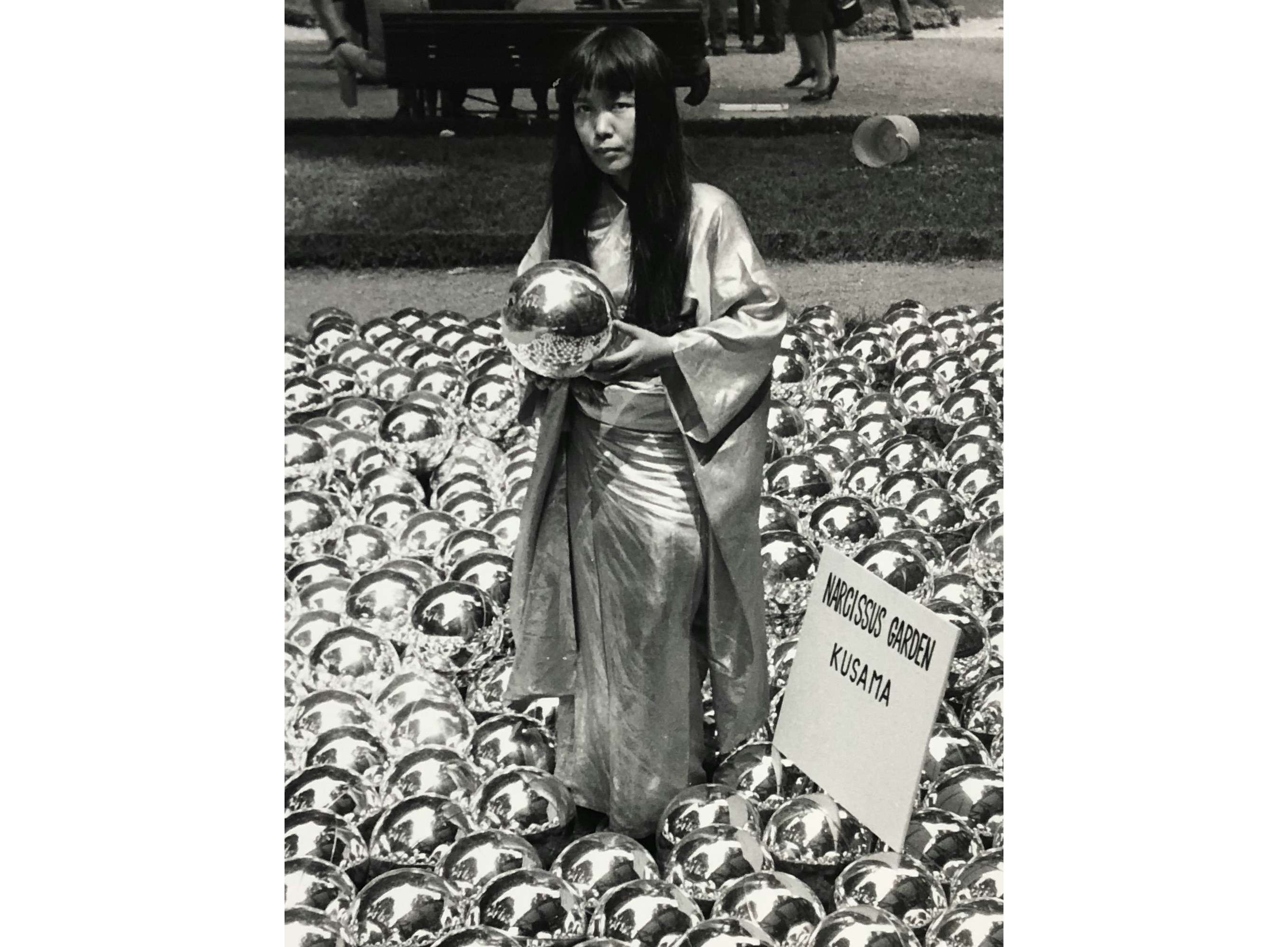 《ナルシスの庭》と草間、第33回ヴェネチア・ビエンナーレにて 1966 ※参考画像 (C) YAYOI KUSAMA