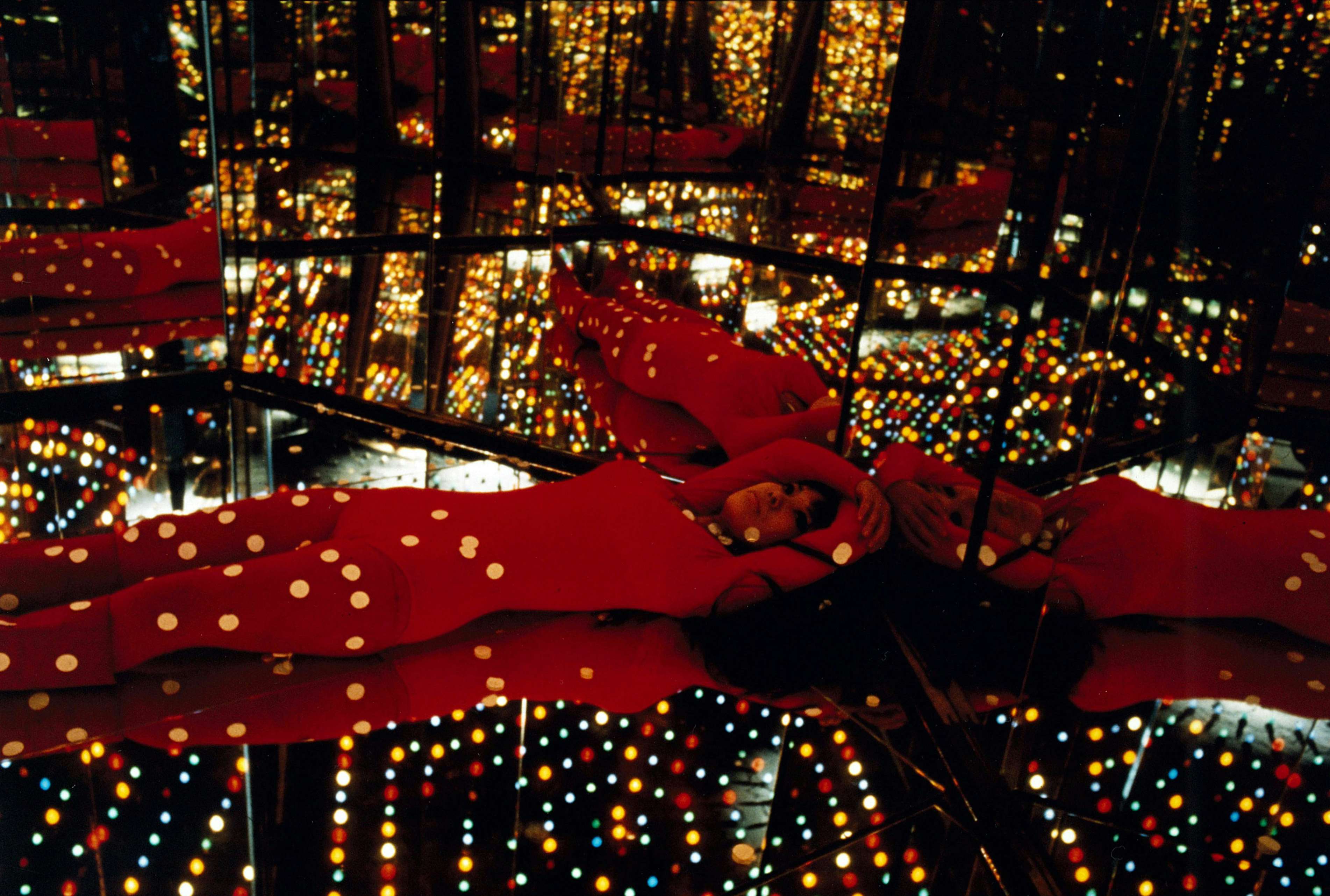 リチャード・カステラーニ画廊(ニューヨーク)での個展「草間のピープ・ショー」(別名「エンドレス・ラヴ・ショー」)にて、六角形のミラールームと草間 1966 ※参考画像 (C)YAYOI KUSAMA