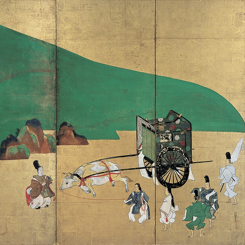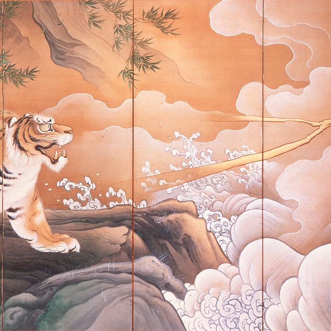 加えて見どころとなるのは、足利義満からの伝来を誇り、本能寺の変における罹災や大坂夏の陣での大破を経て今日の姿に甦った茶道具《付藻茄子》や、近代日本画をリードした画家・橋本雅邦の代表作であり、近代絵画で初めての重要文化財に指定された《龍虎図屏風》(1895)といった至宝の数々。