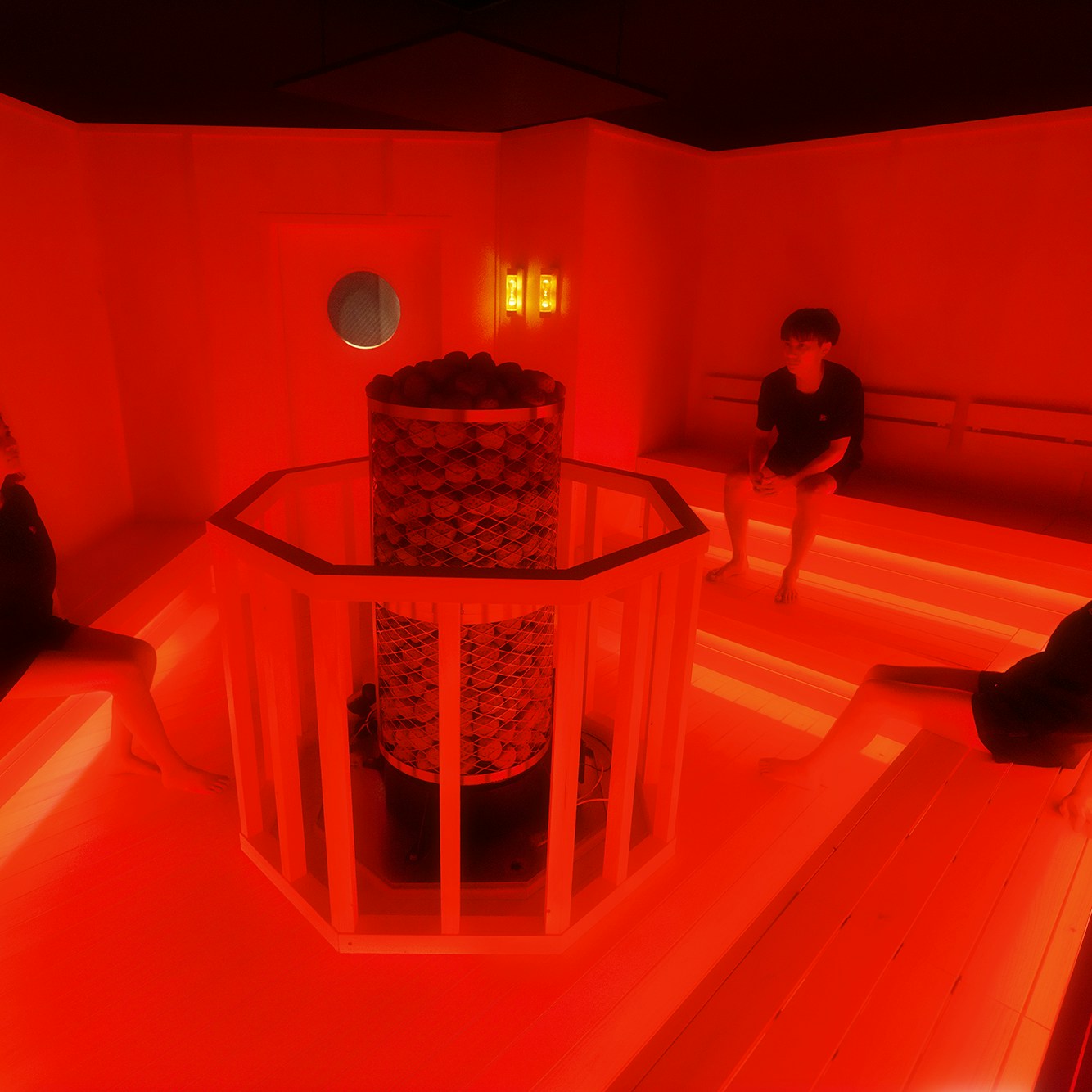 サウナは様々な温度・湿度を組み合わせた男女共用5室・女性専用2室を備え、白樺やほうじ茶の香り、そして焚き火や水琴窟といった環境音を体験することができる。サウナエリアには、ランプの光が伝播する《呼応するランプのアレイとスパイラル》を設置。