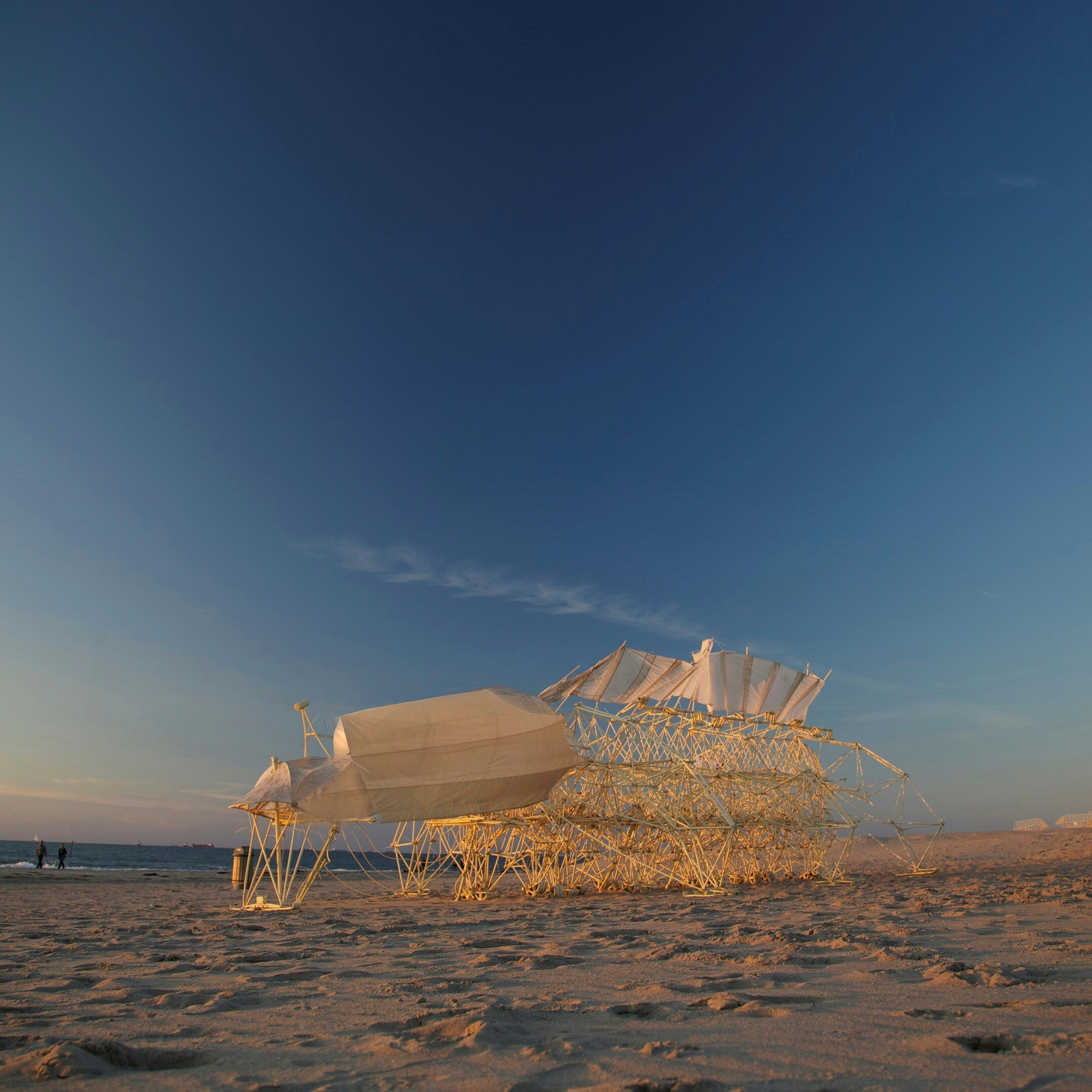 オランダ出身のヤンセンは大学で物理学を学んだ後画家に転向し、1990年に「ストランドビースト」の制作を開始。オランダ語で「砂浜の生命体」を意味するストランドビーストは、プラスチックのチューブやペットボトルなど身近な素材を組み合わせ、物理学による計算に基づいて形づくられた、風力で砂浜のうえを歩く巨大な作品だ。