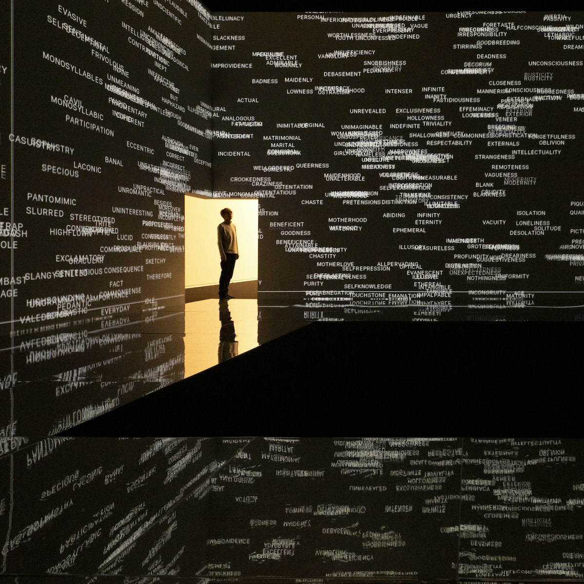 ダムタイプはステートメントで、テキストは「シンプルで普遍的な問いを投げかける」ものだとし、「インターネット/ソーシャル・メディアの進化・発展や、世界的に感染が拡大した新型ウイルスにより大きく変化した、人々のコミュニケーションの方法や世界を知覚する方法について、 あるいは『Post Truth』『Liminal Spaces』について」探求する作品だと説明。「周囲を取り囲む言説群と対比的に、部屋の中央の空所は、どこでもない場所であり、どこでもある場所である」。