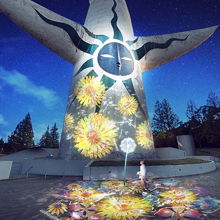今回は高さ約70メートルの《太陽の塔》の北側にある黒い太陽の前に展示される。なお、本プロジェクトは万博記念公園で開催される「イルミナイト万博~2023 WINTER~」の1企画となっている。