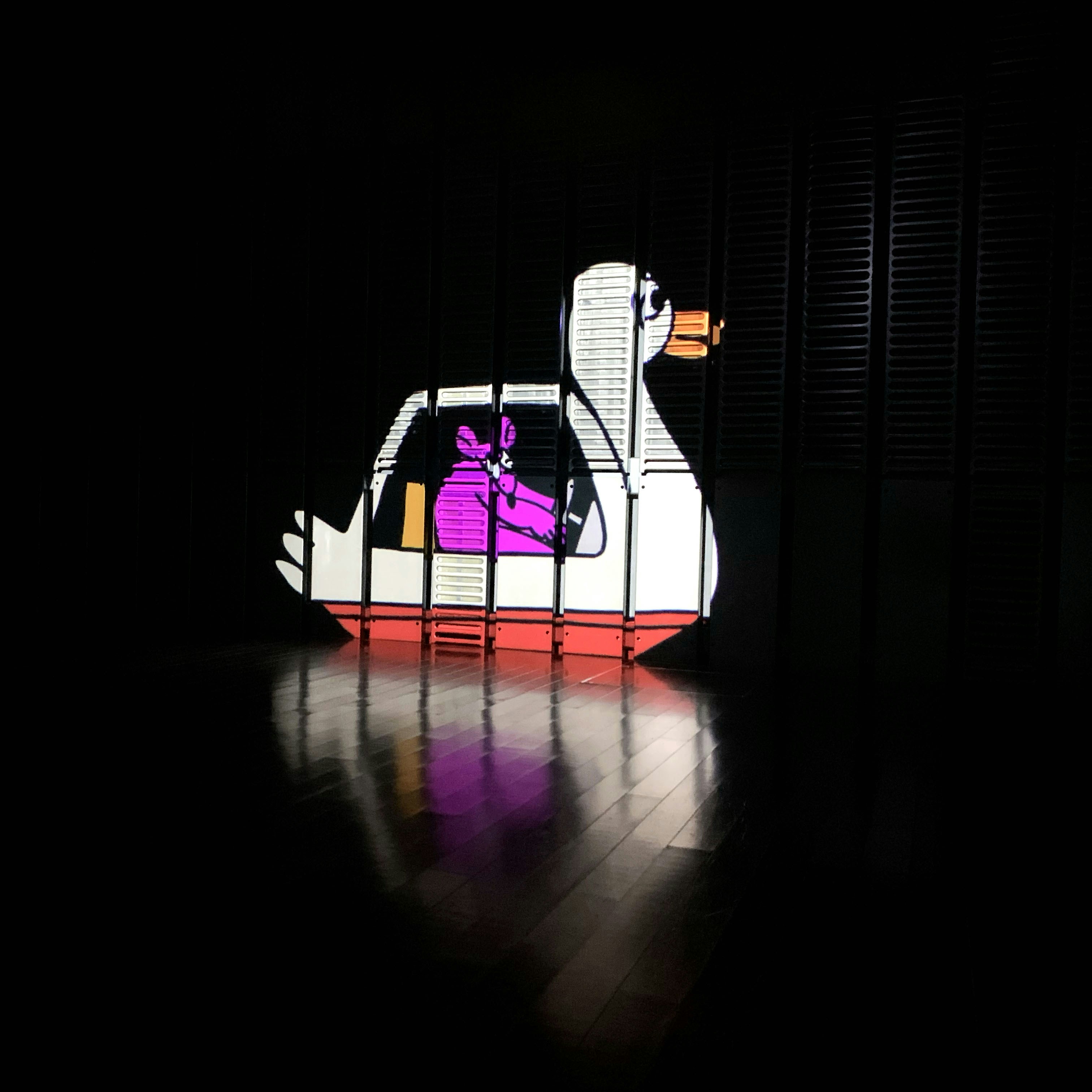 いっぽうのヨハクは、身体の動きを紙芝居、Excel、映像デバイスなど、様々なメディウムや仕組みとかけ合わせることによって、面白いダンスの動きや見え方を追求するユニット。本展では、特殊なパノラマ撮影装置を使った映像パフォーマンス作品《ショー・マスト・ゴー・ラウンド》と、日常生活のなかの動きが現実と映像のなかで交錯する新作《鏡の中のハローグッバイ》が展示され、来館した子供たちはその撮影装置を体験したり、映像のなかで動く自分の姿と遊ぶことができる。