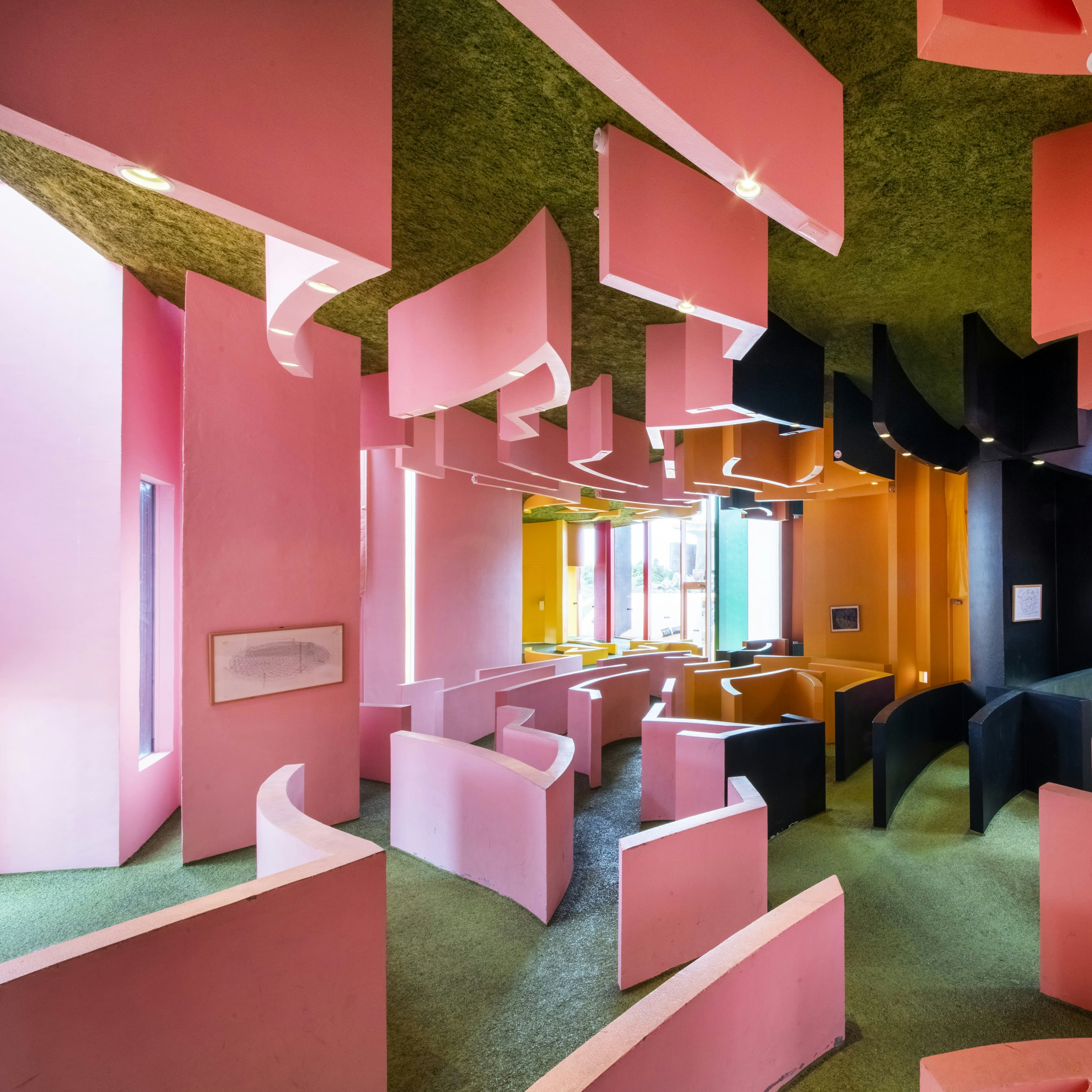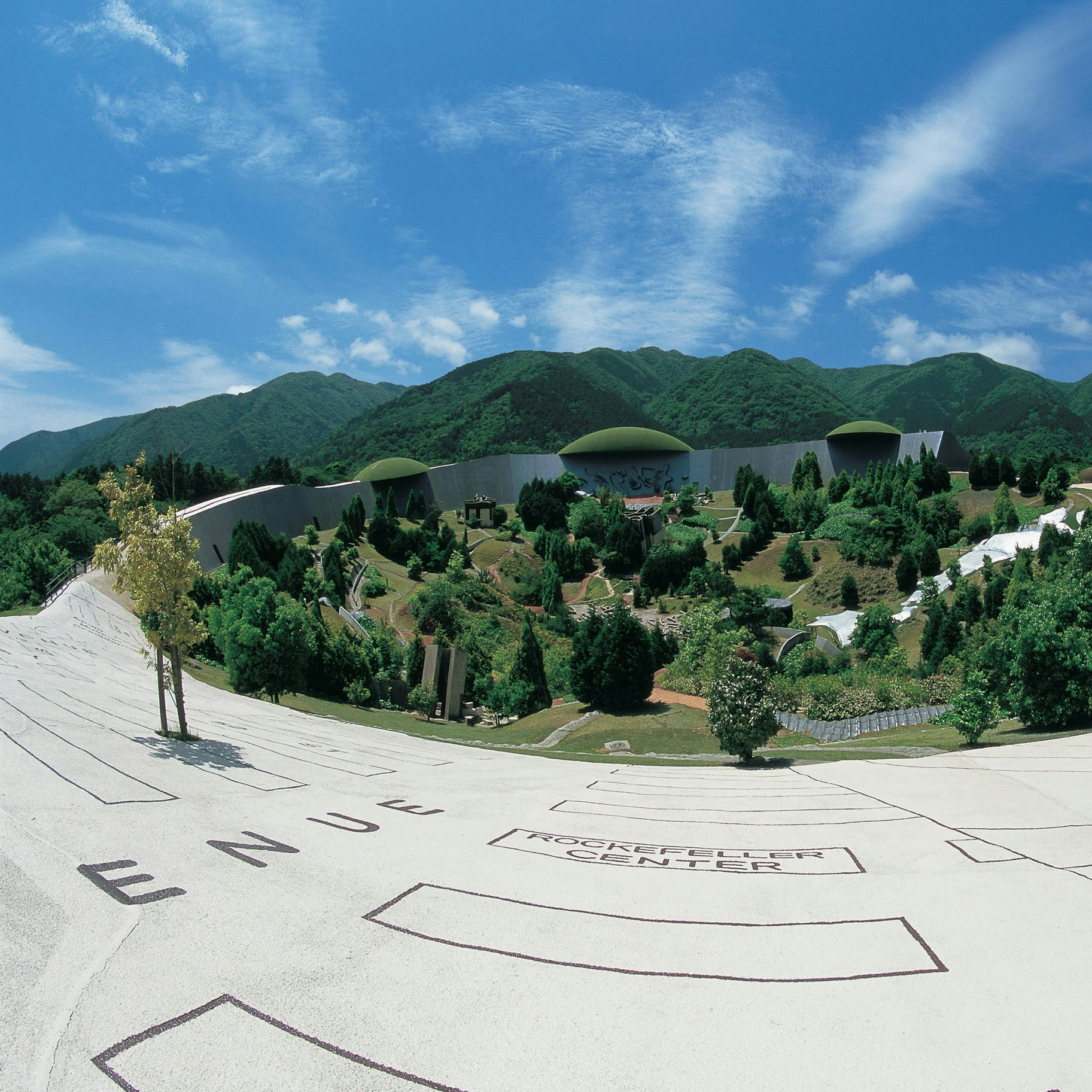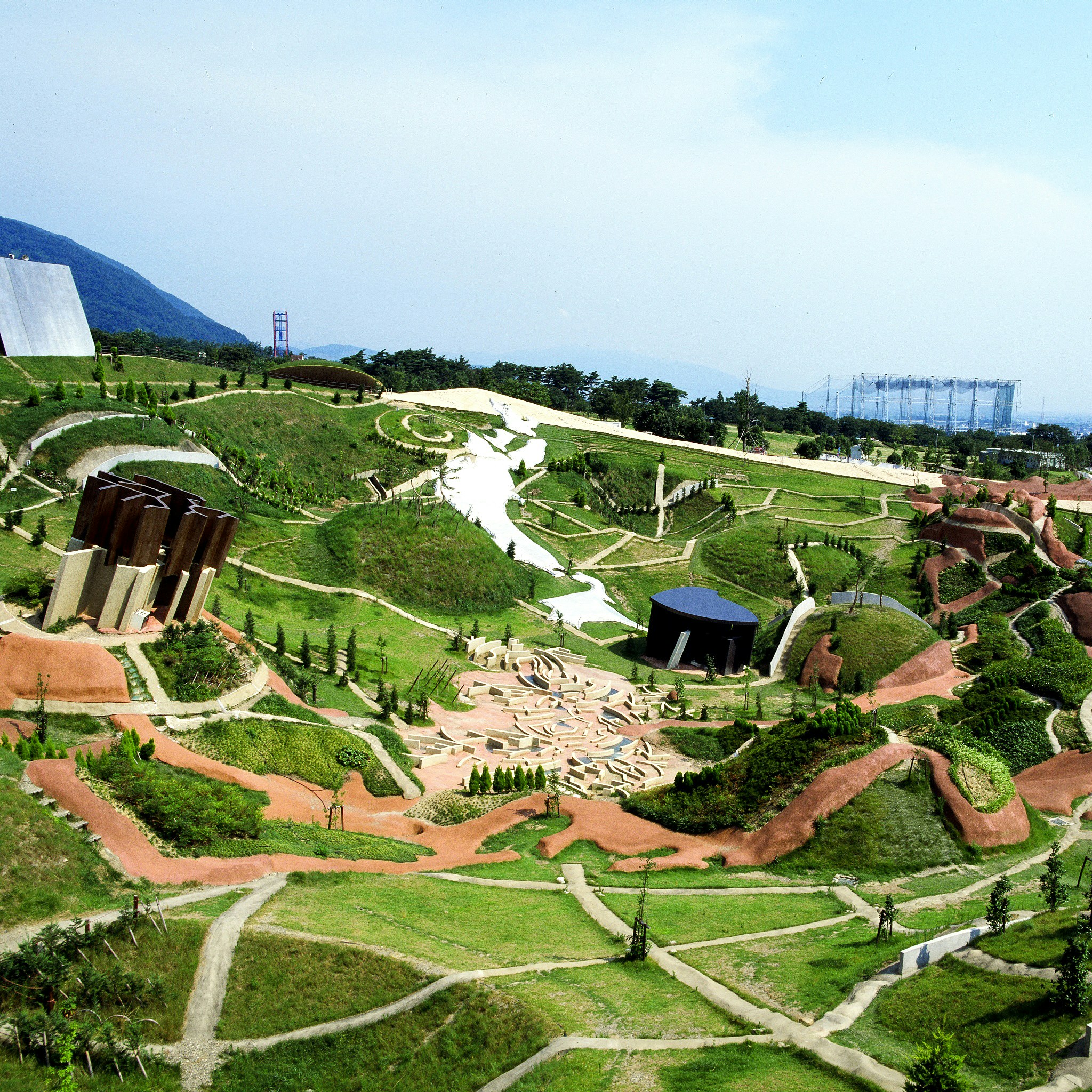 約1万8000平米におよぶ広⼤な敷地には、⽔平、垂直な線は極⼒排除され、⼈⼯的な地平線が数多く配置されるなど、⾄る所に⼈間の平衡感覚や遠近感を混乱させる仕掛けが施されている。ここでは、誰もが⾝体を使い、バランスをとりながら、私たちの⾝体の持つ様々な可能性を⾒つけることができる。