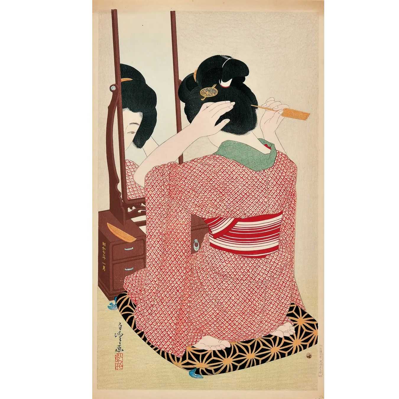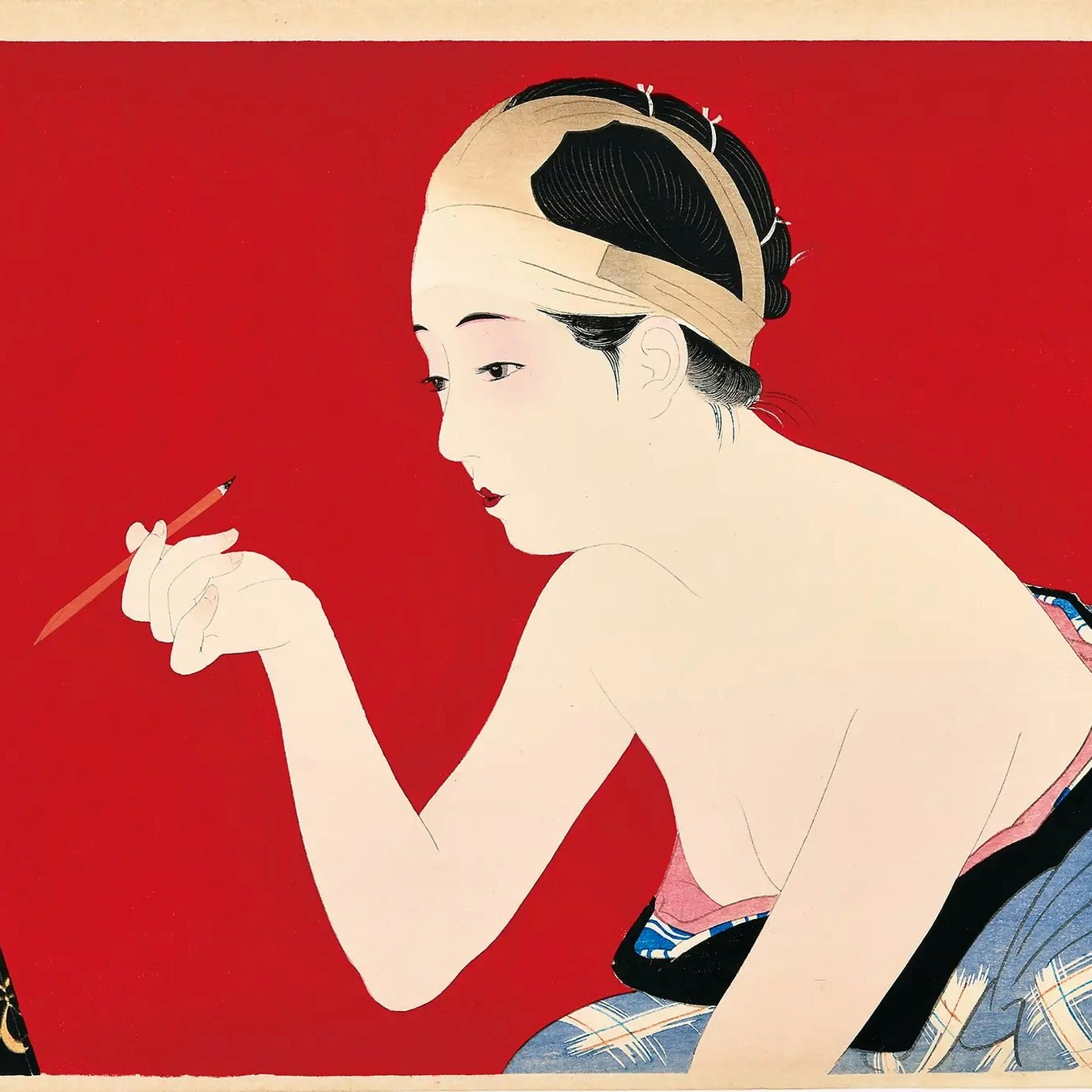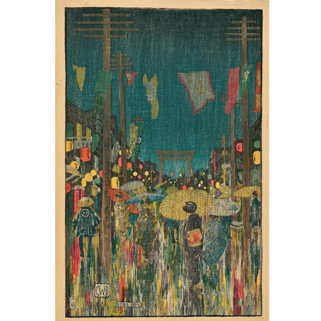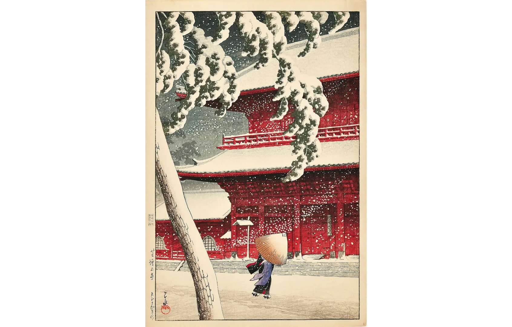 渡邊は17歳で浮世絵商に勤め、バレン摺りによる木版画の美に魅せられる。明治以降衰退していた錦絵の復興と、新たな表現の創出を志し、1909年に東京・京橋で渡邊版画店(現・渡邊木版美術画舗)を設立後、江戸時代以来の絵師・彫師・摺師による協業体制を継承。高品質な素材と高度な手摺り技法を駆使した木版画制作に取り組んだ。その成果は、大正から昭和初期にかけて国内外で広がる「新版画ムーブメント」を牽引することとなる。