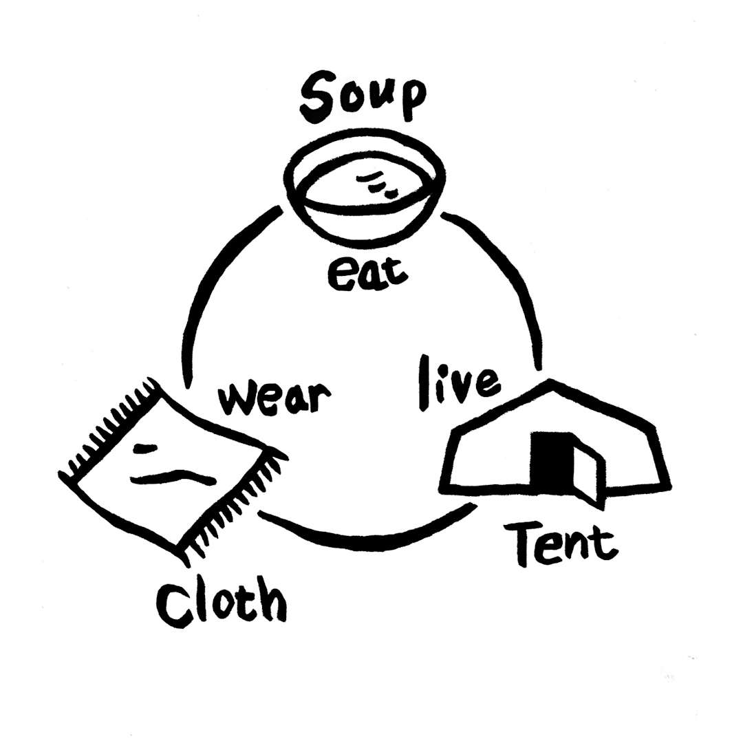 本展は「スープ」というキーワードを入り口に、衣食住の根源をあらためて見つめ直すものだ。スープは、水と食材を火にかけるという最小の行為から生まれるが、その一杯には、素材に宿る力、熱の移ろい、土地の歴史、身体の感覚、器や食空間の佇まいといった多様な層が同時に息づいている。こうした目に見えにくい事象を手がかりとして、生活をかたちづくる環境を「包む」という視点から紐解いていく。