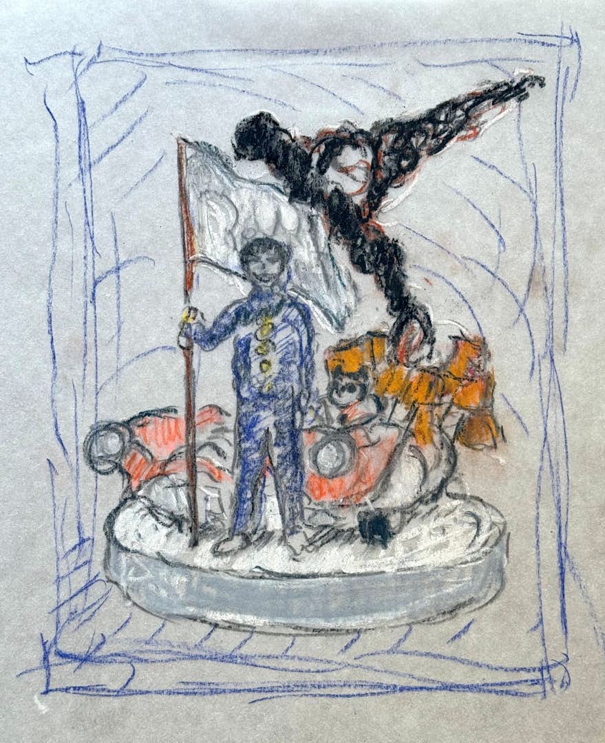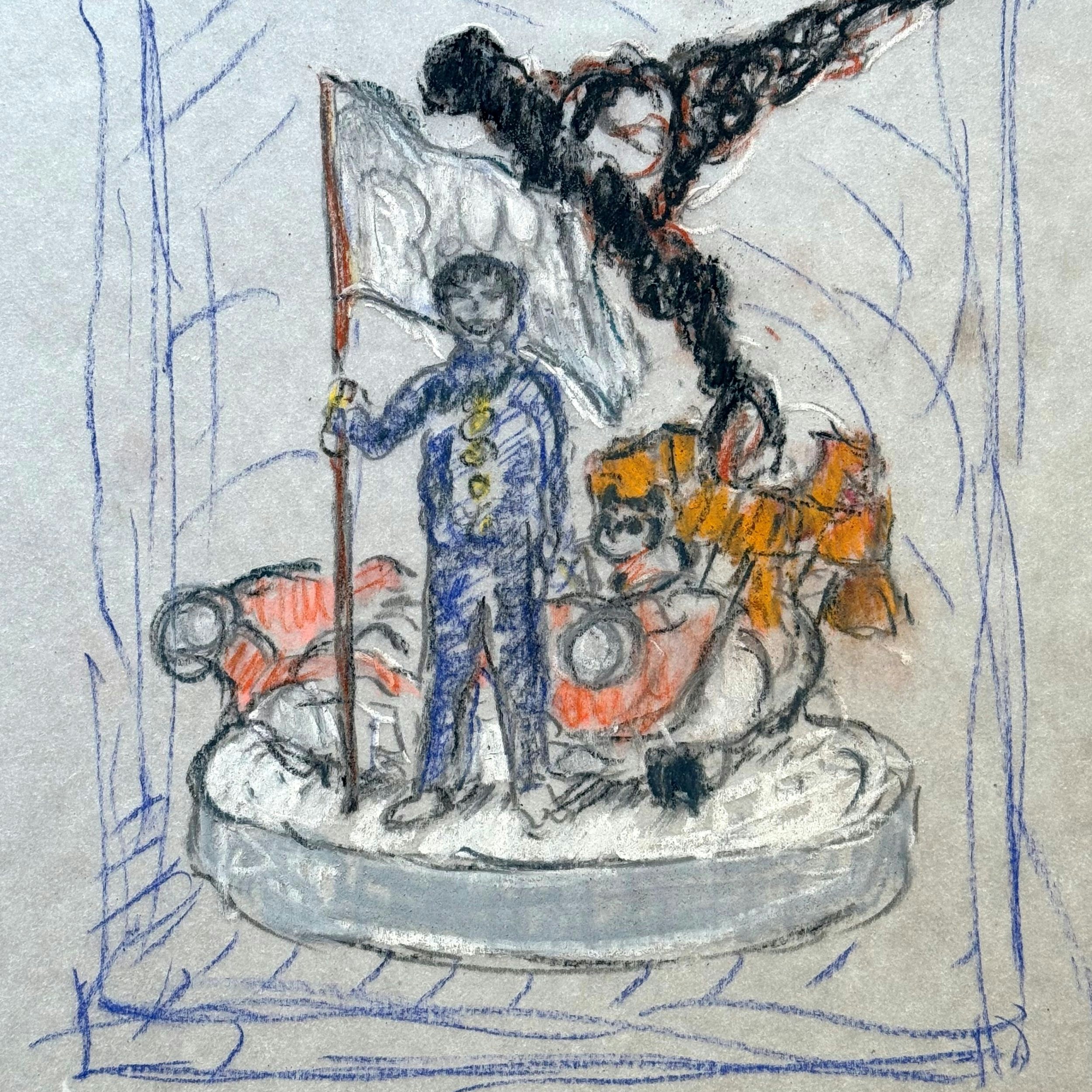 展覧会はプロローグにおいて、3人の共同制作の様相を呈する立体作品から始まる。それは純然たる合作というよりも、「私たちは、それぞれの旗を掲げる」という宣言の場であり、三者三様の立場表明が示される導入部になるという。